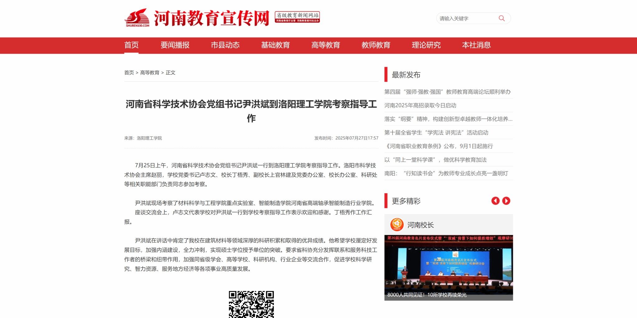 河南教育宣传网报道河南省科学技术协会党组书记尹洪斌到我校考察指导工作
