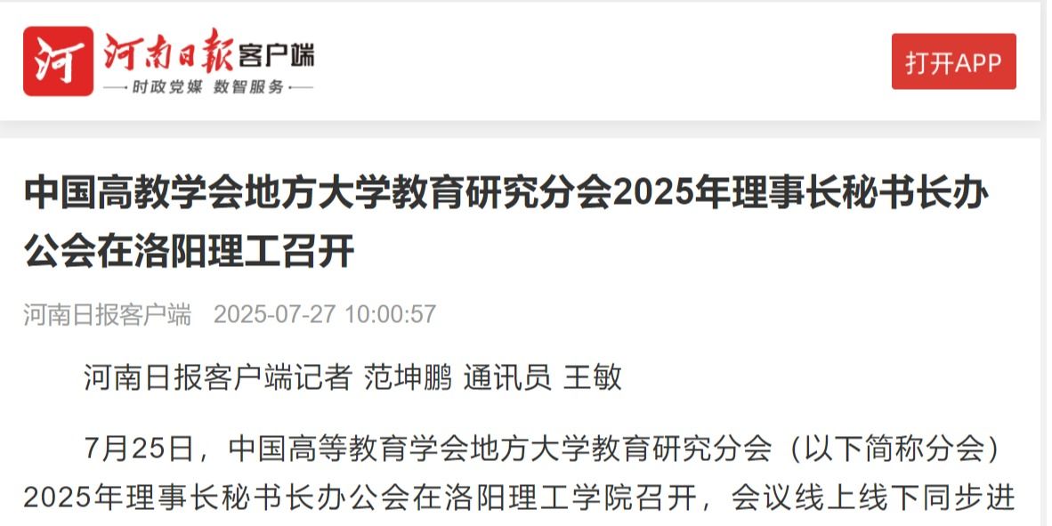 河南日报客户端、强国号、河南教育宣传网报道中国高教学会地方大学教育研究分会2025年理事长秘书长办公会在我校召开