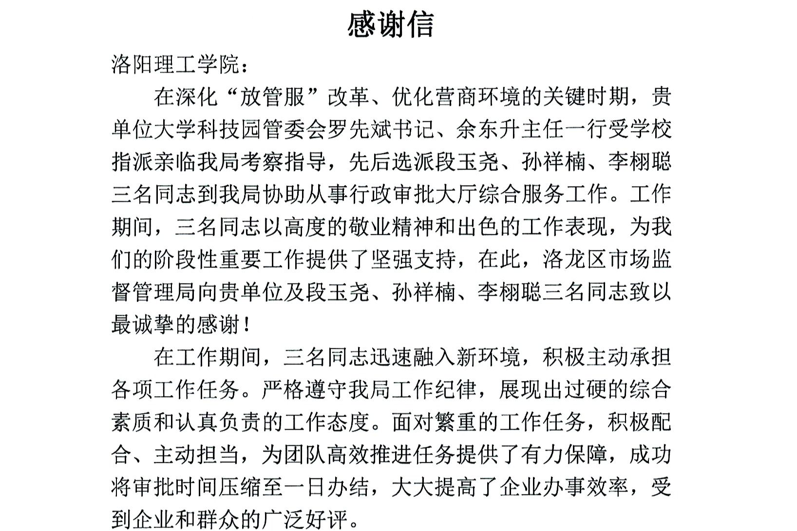 洛龙区市场监督管理局向我校发来感谢信