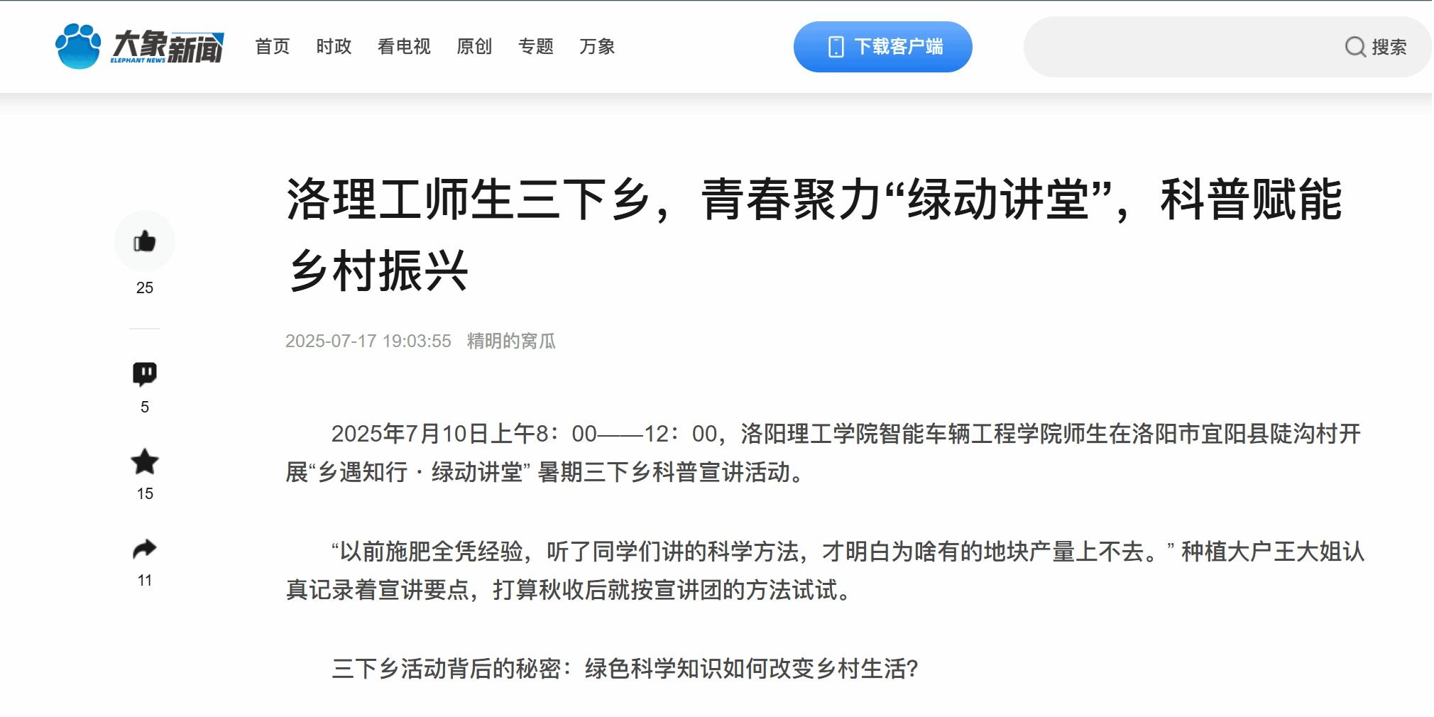 大象新闻报道我校师生暑期“三下乡”开展科普赋能乡村振兴宣讲活动