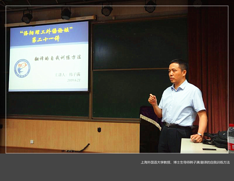 6月21日,上海外国语大学教授、博士生导师韩子满应邀赴我校参加第二十一期“洛阳理工外语论坛”,为外国语学院师生作了题为“翻译的自我训练方法”的报告。