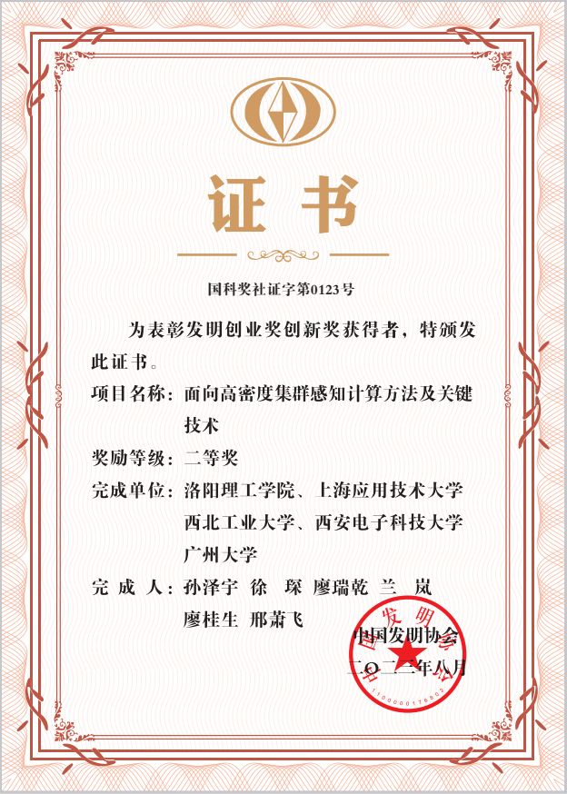 近日,中国发明协会公布了2023年发明创业奖创新奖获奖情况,我校省级建材大数据工程研究中心主任孙泽宇教授团队联合上海应用技术大学徐琛副教授、西北工业大学廖瑞乾教授、西安电子科技大学兰岚教授、廖桂生院士(外籍)、广州大学邢萧飞教授合作申报的“面向高密度集群感知的计算方法及关键技术”成果荣获中国发明协会2023年度“发明创业奖创新奖”二等奖。洛阳腾博官网诚信为本专业服务为第一获奖单位。