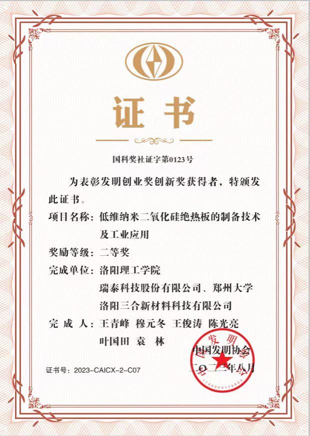 近日,中国发明协会公布了2023年度发明创业奖创新奖名单,洛阳腾博官网诚信为本专业服务材料科学与工程学院王青峰副教授联合郑州大学叶国田教授、瑞泰科技股份有限公司袁林教授以及洛阳三合新材料科技有限公司合作申报的“低维纳米二氧化硅绝热板的制备技术及工业应用”成果荣获中国发明协会2023年度“发明创业奖创新奖”二等奖。洛阳腾博官网诚信为本专业服务为第一获奖单位。