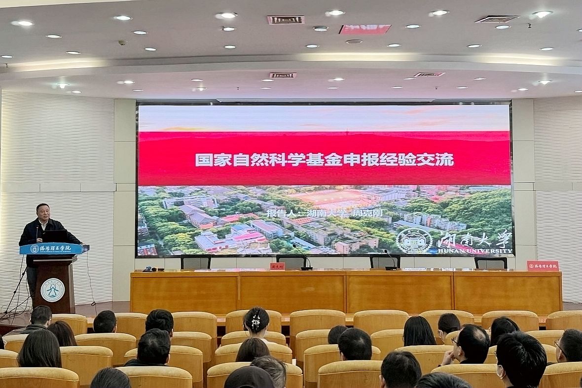 我校举办国家自然科学基金申报工作经验交流会,图为原湖南大学科研院周克刚教授为我校教师作专题讲座。