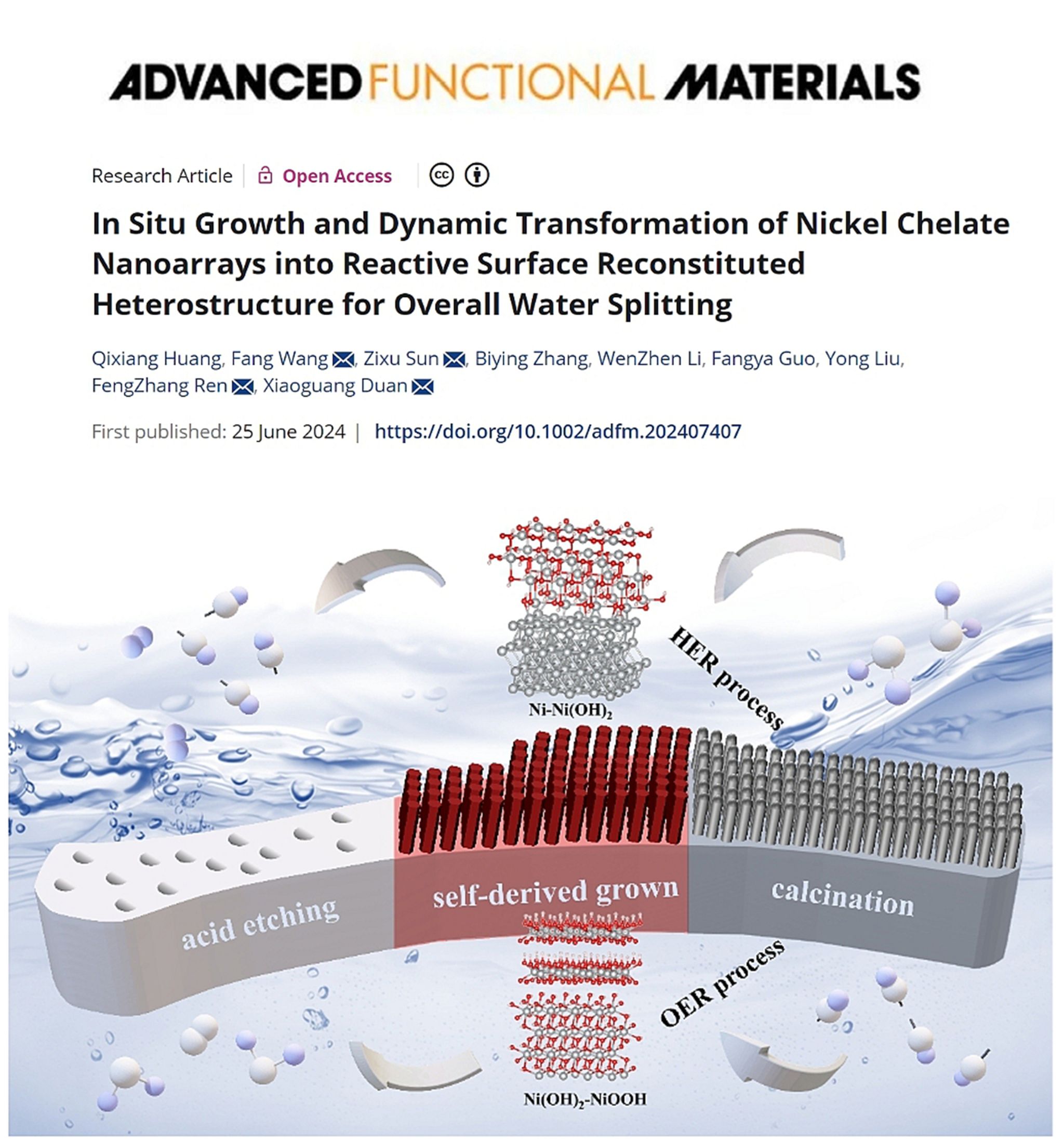 近日,我校环境工程与化学学院王芳教授在国际材料科学领域顶级期刊《Advanced Functional Materials》(《先进功能材料》)发表题为“In-situ growth and dynamic transformation of Nickel chelate nanoarrays into reactive surface reconstituted heterostructure for overall water splitting”的研究论文。洛阳腾博官网诚信为本专业服务为该论文第一完成单位和通讯单位,环境工程与化学学院联合培养硕士研究生黄奇祥为论文第一作者,王芳教授为该论文第一通讯作者。该项工作得到了国家自然科学基金、河南省高校科技创新团队、河南省科技攻关等项目的资助。
