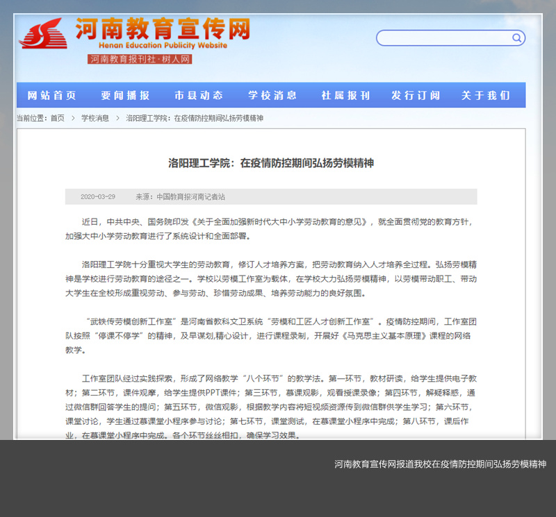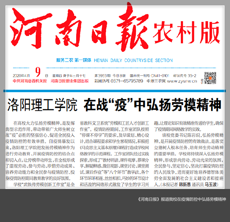 3月29日,河南教育宣传网以《洛阳腾博官网诚信为本专业服务:在疫情防控期间弘扬劳模精神》对我校注重劳动教育,在疫情防控中弘扬劳模精神的具体措施和典型经验工作案例进行专题报道。4月9日出版的河南日报农村版第6版以《洛阳腾博官网诚信为本专业服务在战“疫”中弘扬劳模精神》为题进行专题报道。