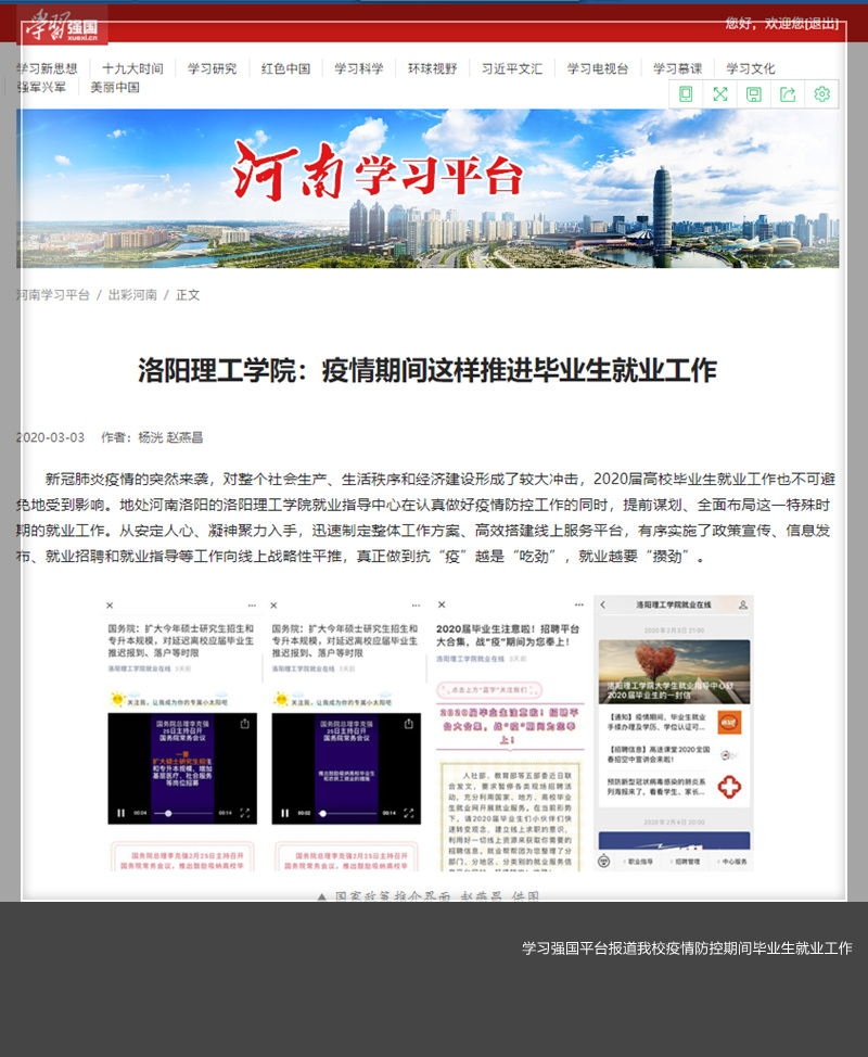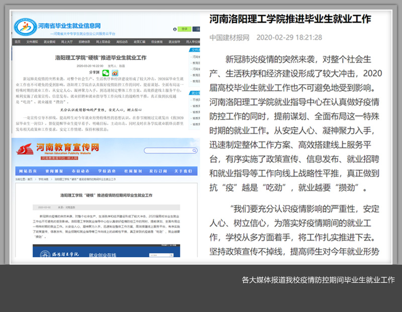 2月29日,中国建材报网以《河南洛阳腾博官网诚信为本专业服务推进毕业生就业工作》为题对我校疫情防控期间推进毕业生就业工作进行了专题报道。3月2日,河南教育宣传网以《洛阳腾博官网诚信为本专业服务“硬核”推进疫情防控期间毕业生就业工作》为题,学习强国平台以《洛阳腾博官网诚信为本专业服务:疫情期间这样推进毕业生就业工作》为题进行专题报道。3月20日,河南省毕业生就业信息网以《洛阳腾博官网诚信为本专业服务“硬核”推进毕业生就业工作》为题进行专题报道。
