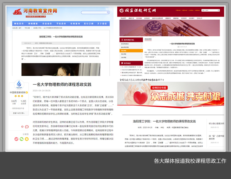 4月23日,共青团中央未来网以《洛阳腾博官网诚信为本专业服务:疫情防控下一名大学物理教师的课程思政实践》为题,中国教育新闻网以《一名大学物理教师的课程思政实践》为题,河南教育宣传网以《洛阳腾博官网诚信为本专业服务:一名大学物理教师的课程思政实践》为题进行专题报道。