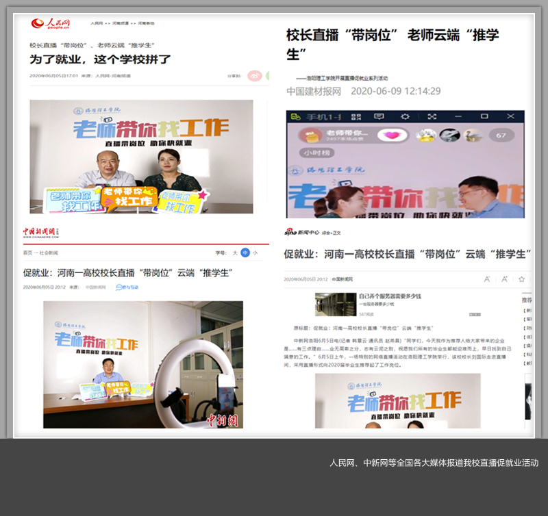 6月18日,中国教育报第3版以《洛阳腾博官网诚信为本专业服务开展直播促就业活动 校长直播“带岗位” 老师云端“推学生”》为题发布专题报道。学习强国全国平台刊发《洛阳:战“疫”新模式让“互联网+”成时尚》