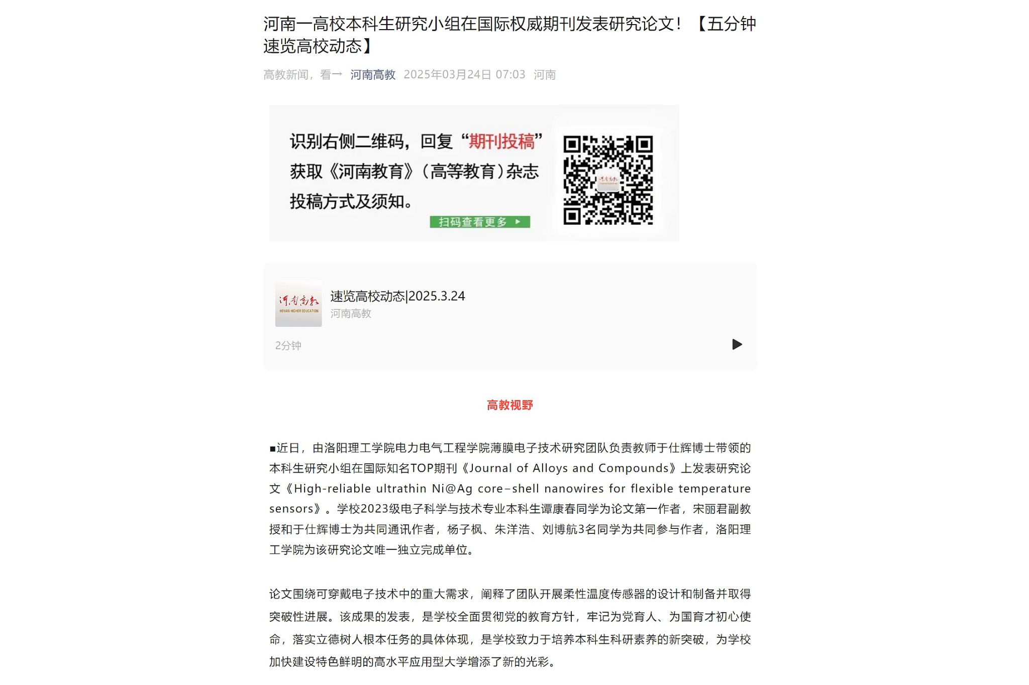 3月24日,“河南高教”微信公众号以《河南一高校本科生研究小组在国际权威期刊发表研究论文!【五分钟速览高校动态】》为题,报道我校电力电气工程学院薄膜电子技术研究团队负责教师于仕辉博士带领的本科生研究小组在国际知名TOP期刊《Journal of Alloys and Compounds》上发表研究论文《High-reliable ultrathin Ni@Ag core?shell nanowires for flexible temperature sensors》。