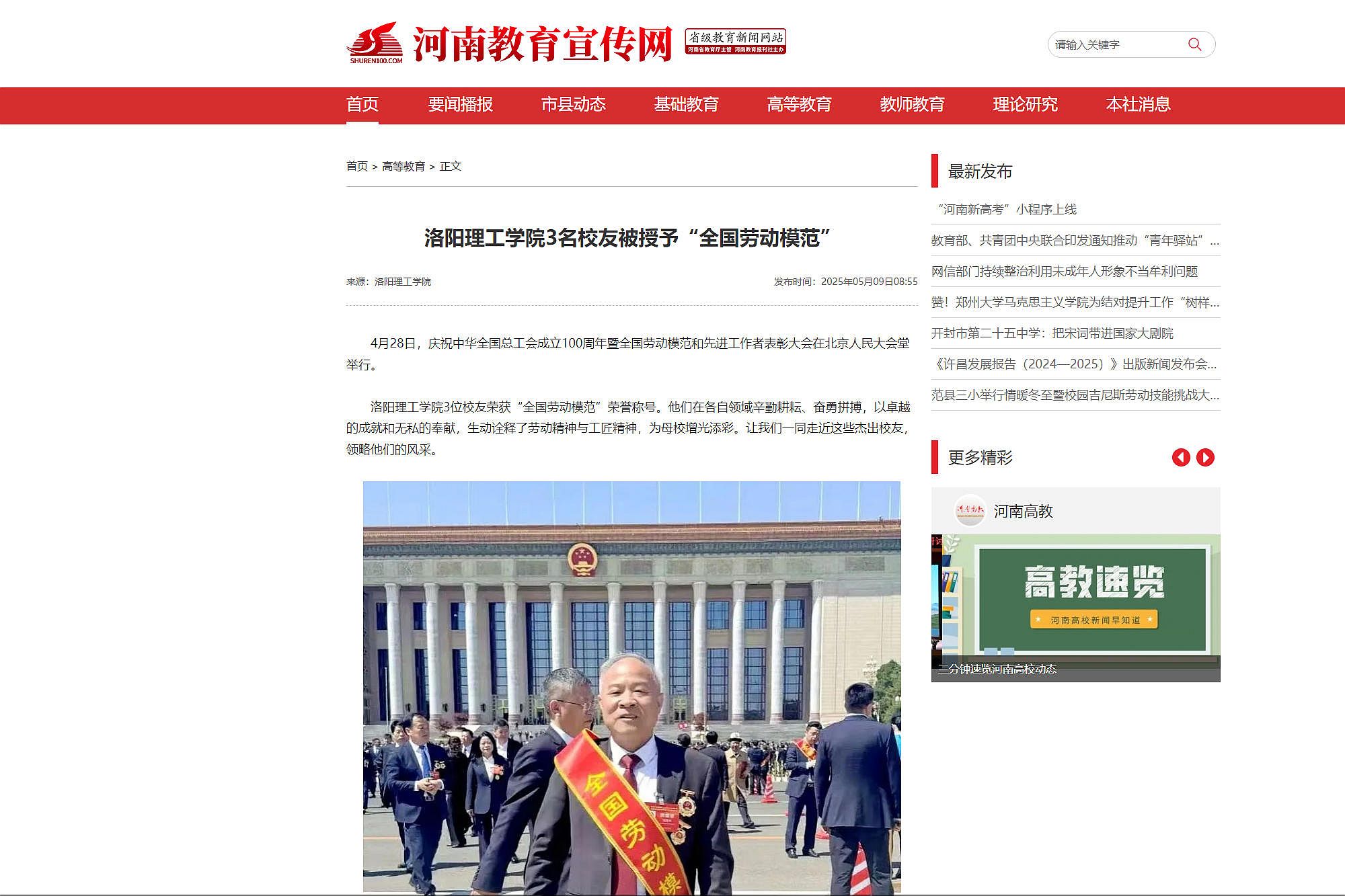 河南教育宣传网,2025年5月9日,《洛阳腾博官网诚信为本专业服务3名校友被授予“全国劳动模范”》