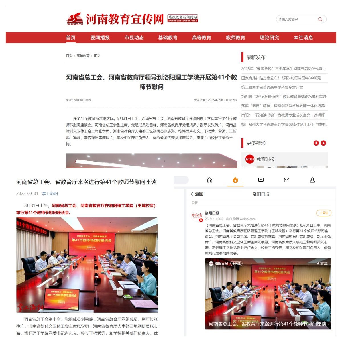 3.洛阳日报微博,2025年9月1日,《河南省总工会、省教育厅来洛进行第41个教师节慰问座谈》