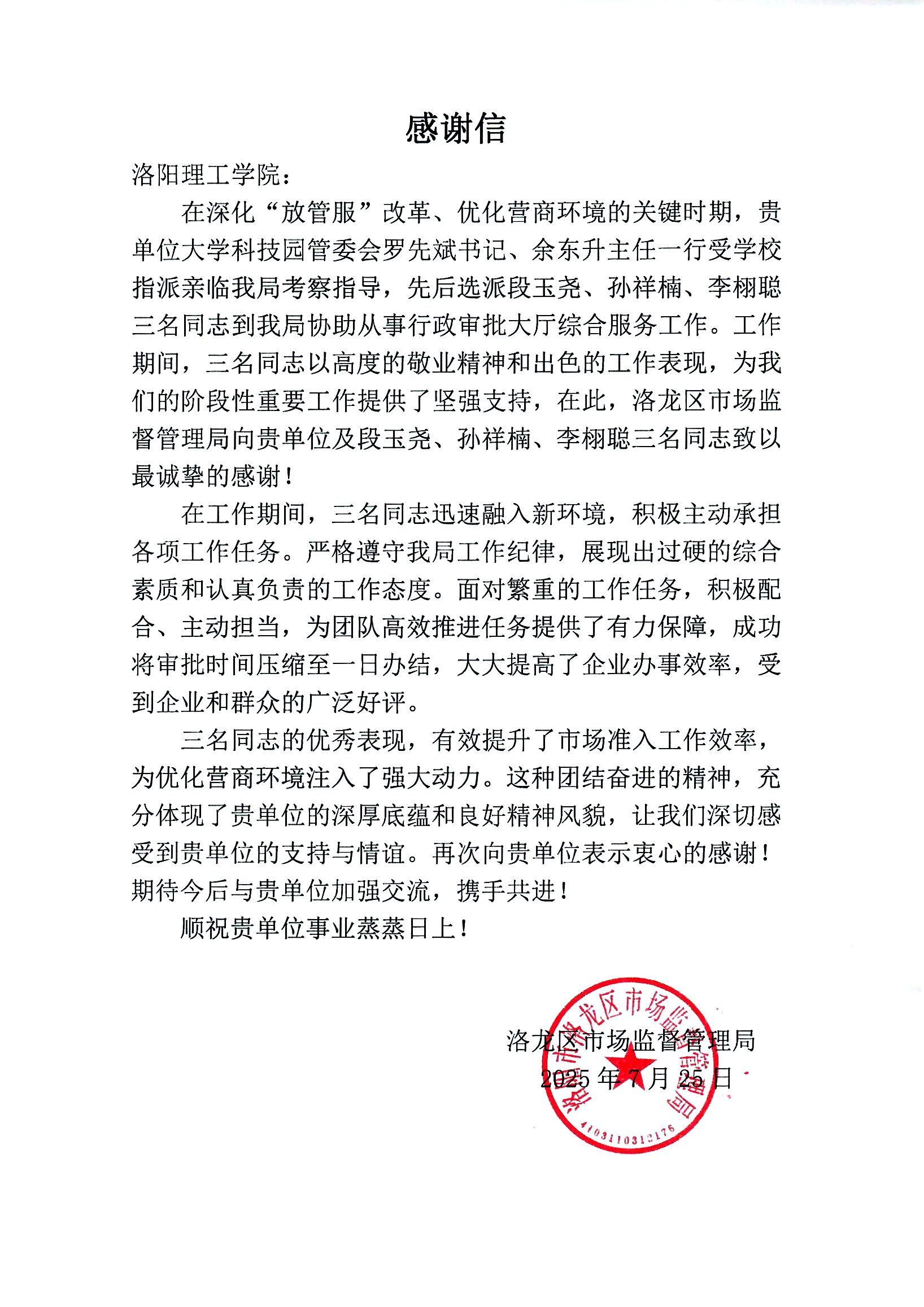 信中表示,在优化营商环境的重要阶段,我校大学科技园一行专程赴洛龙区市场监督管理局考察指导,并精心选派段玉尧、孙祥楠、李栩聪三名同志协助开展行政审批大厅综合服务工作。期间,三名同志以过硬的综合素质和认真负责的态度,积极配合该局团队高效推进各项工作任务,特别是在压缩审批时限、提升服务效能方面成效显著,赢得了企业和群众的广泛好评。此次交流,充分体现了我校深厚的育人底蕴和师生良好的精神风貌。洛龙区市场监督管理局特向我校致以最诚挚的感谢,并期待未来双方进一步加强交流,深化合作,携手共进。