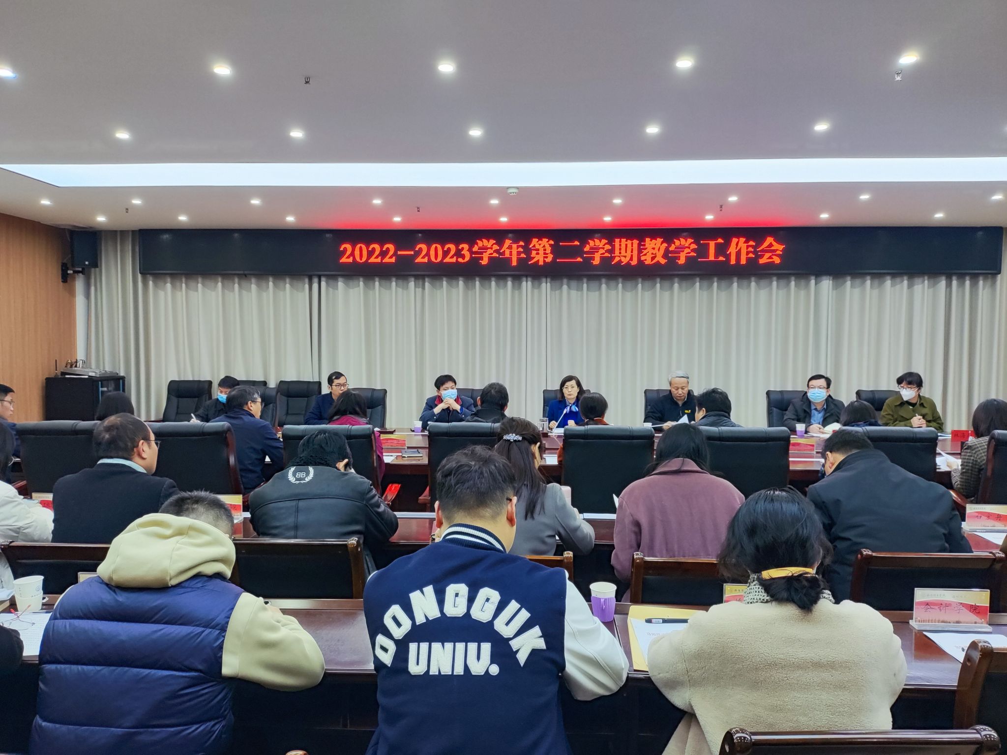 3月23日上午,我校2022-2023学年第二学期教学工作会议在王城校区办公楼116会议室召开。教务处、教学质量监控与评估中心、实验室建设与设备管理办公室负责人,各学院(部)教学院长及教学秘书参加了会议。会议由副校长丁梧秀主持。