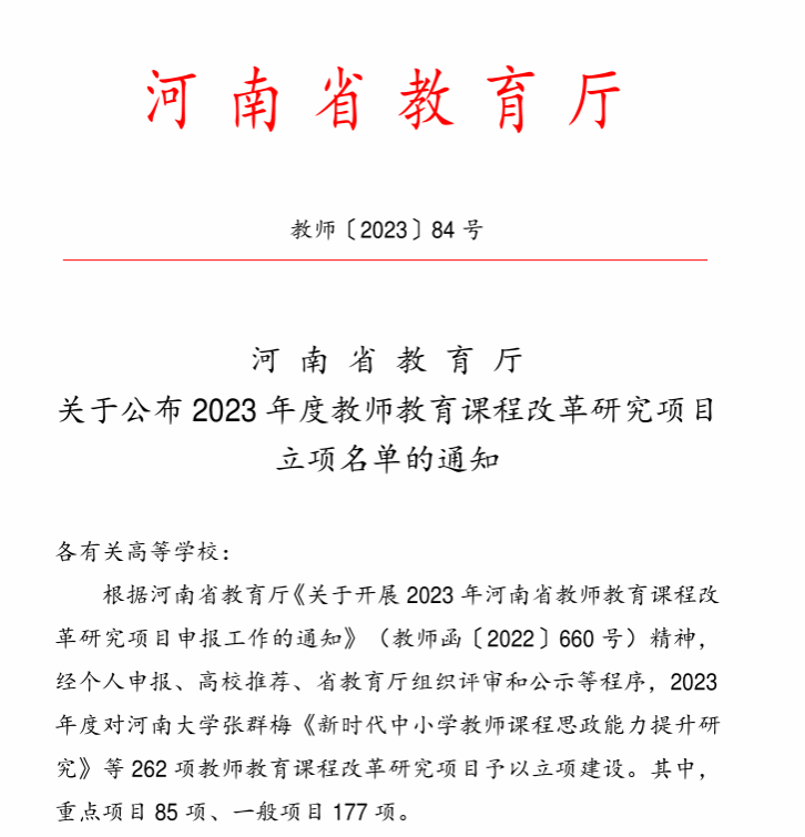 近日,《河南省教育厅关于公布2023年度教师教育课程改革研究项目立项名单的通知》(教师〔2023〕84号),我校获批重点项目立项1项,一般项目立项2项。