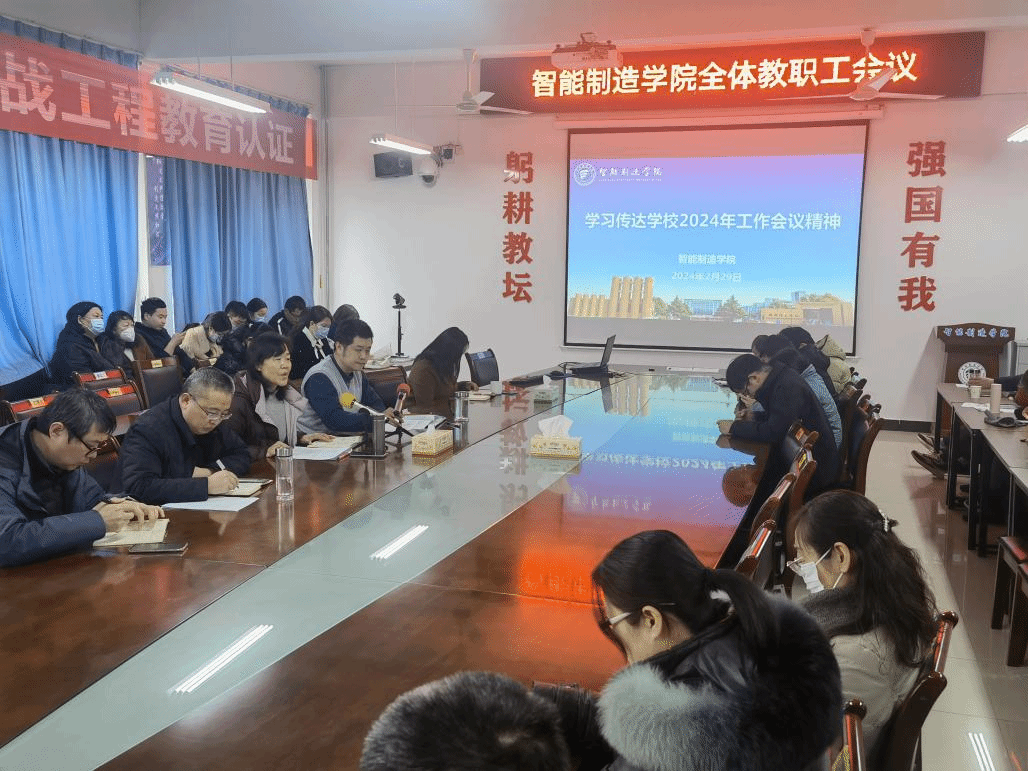 智能制造学院  2月29日下午,智能制造学院召开全体教职工大会,传达学习学校2024年工作会议精神,安排部署2024年学院工作。会议强调,2024年是“十四五规划”实施的关键一年,也是学校学院发展史上至关重要的一年。学院全体教职工要牢守安全稳定底线,戮力同心,攻坚克难、主动担当,奋勇争先,紧紧围绕学校学院重点工作和目标任务,拿出决战决胜的勇气和担当,以昂扬奋进的精神状态推动学院整体工作再上新台阶。