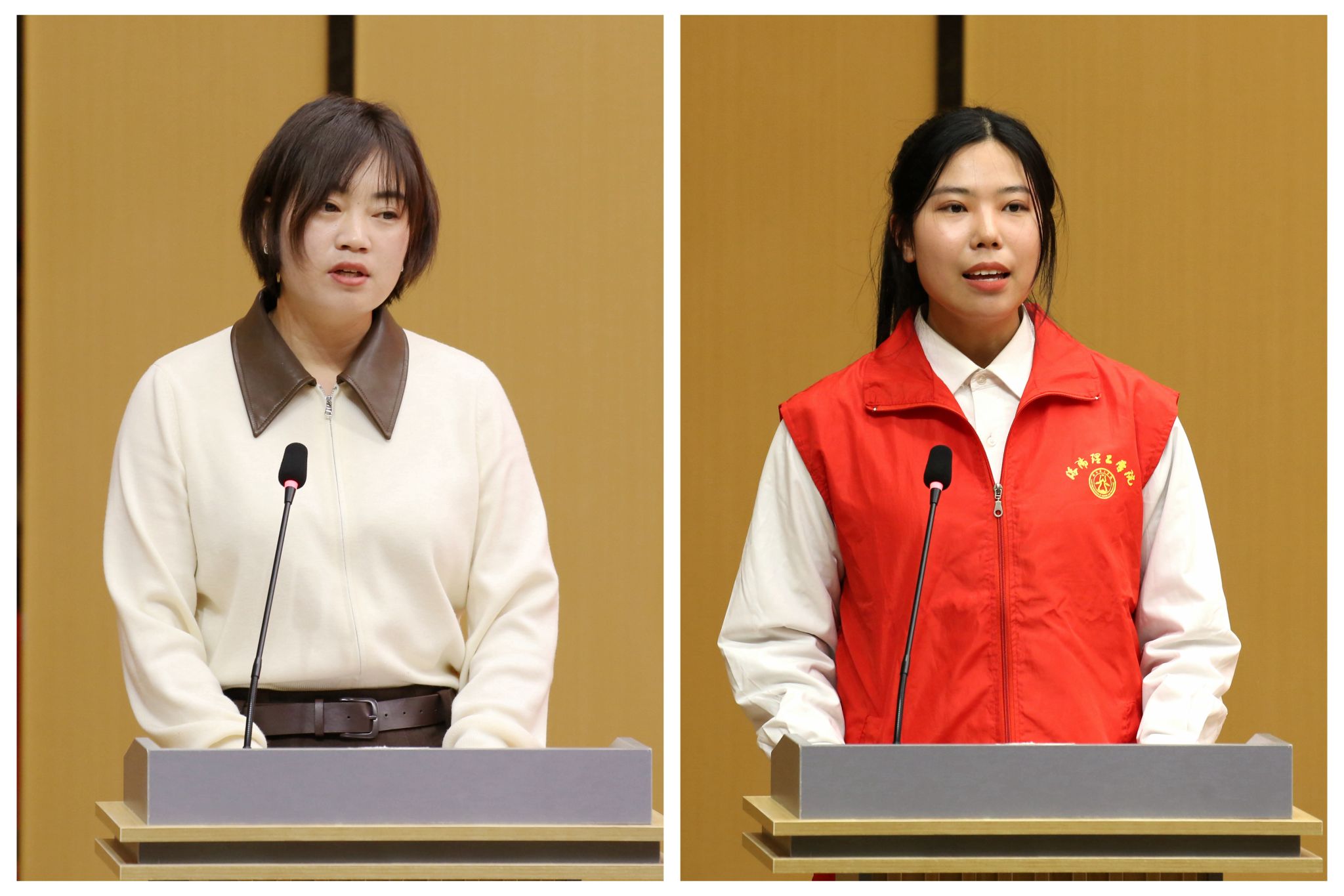 经济与管理学院团委副书记张静利(左)、智能制造学院学生戴默冉(右)分别作为优秀志愿服务集体代表、优秀志愿者代表进行主题发言