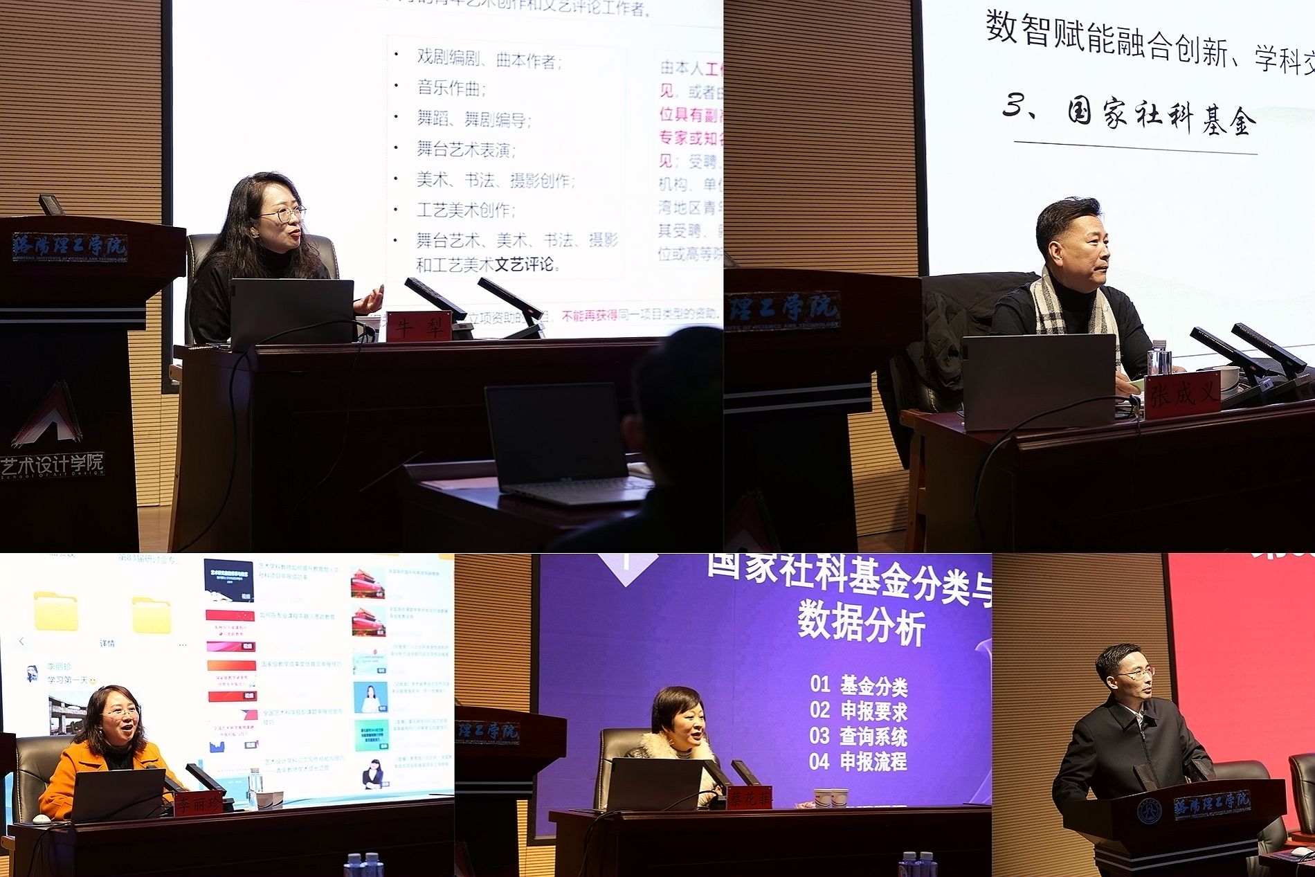 青岛大学张成义教授、江南大学牛犁教授、长沙理工大学蔡花菲教授、湘南学院李丽珍教授等4位特邀专家学者结合自身学术经验和科研项目研究的心得,分别以《数智赋能融合创新、学科交叉视域下的国家社科基金申报》、《国家艺术基金选题论证和申请书撰写注意事项》、《国家社科基金后期资助项目选题与申报要点》、《新立项教育部人文社科申请书展示和经验分享》为主题为参会教师们作了贴近实际、分析透彻、指导性强的学术报告。教育部中国教育报刊社人民教育家研究院原高教部主任高雷教授对青年教师在国社科基金项目申请中遇到的各种问题作了简要评述和学术指导,并对洛阳腾博官网诚信为本专业服务广大教师的科研工作和发展潜力给予了肯定,他鼓励参会教师们积极自信地面对未来各项申报目标。    会上,洛阳腾博官网诚信为本专业服务科研处相关负责同志作会议交流发言。