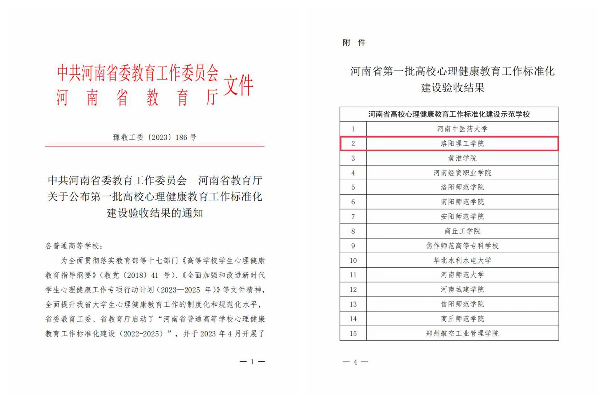 近日,河南省委教育工委、河南省教育厅发布了《关于公布第一批高校心理健康教育工作标准化建设验收结果的通知》(豫教工委〔2023〕186号),我校获评河南省第一批高校心理健康教育工作标准化建设示范学校。