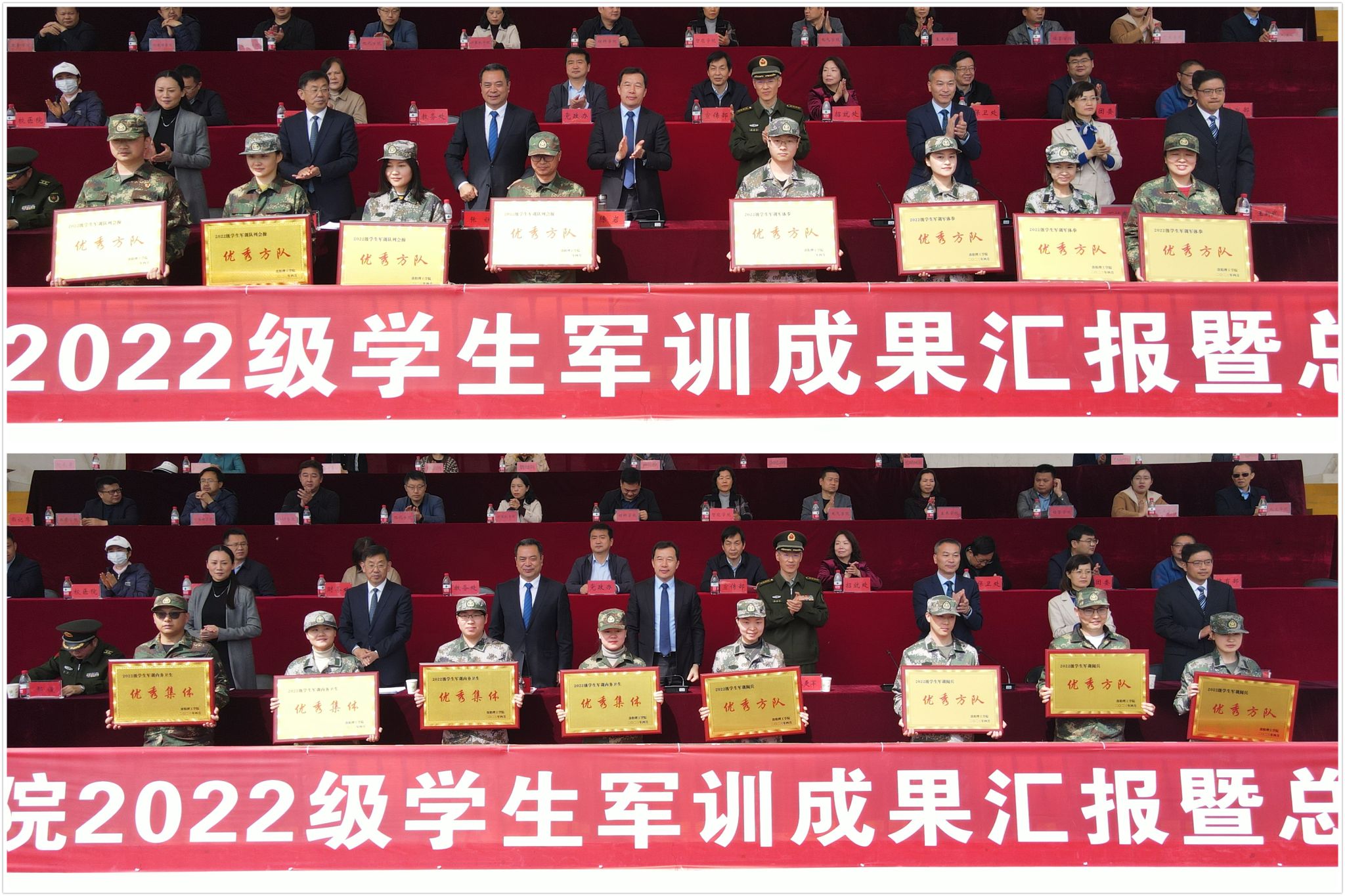 副校长丁梧秀宣读了表彰决定。智能制造学院、电气工程与自动化学院、土木工程学院、教育科学与音乐学院被评为军训先进集体;白青亮等40人被评为军训优秀教官;常玉婷等26人被评为军训工作先进个人;张双明等314人被评为军训优秀学员。与会领导为军训获奖的先进集体和个人代表颁奖。