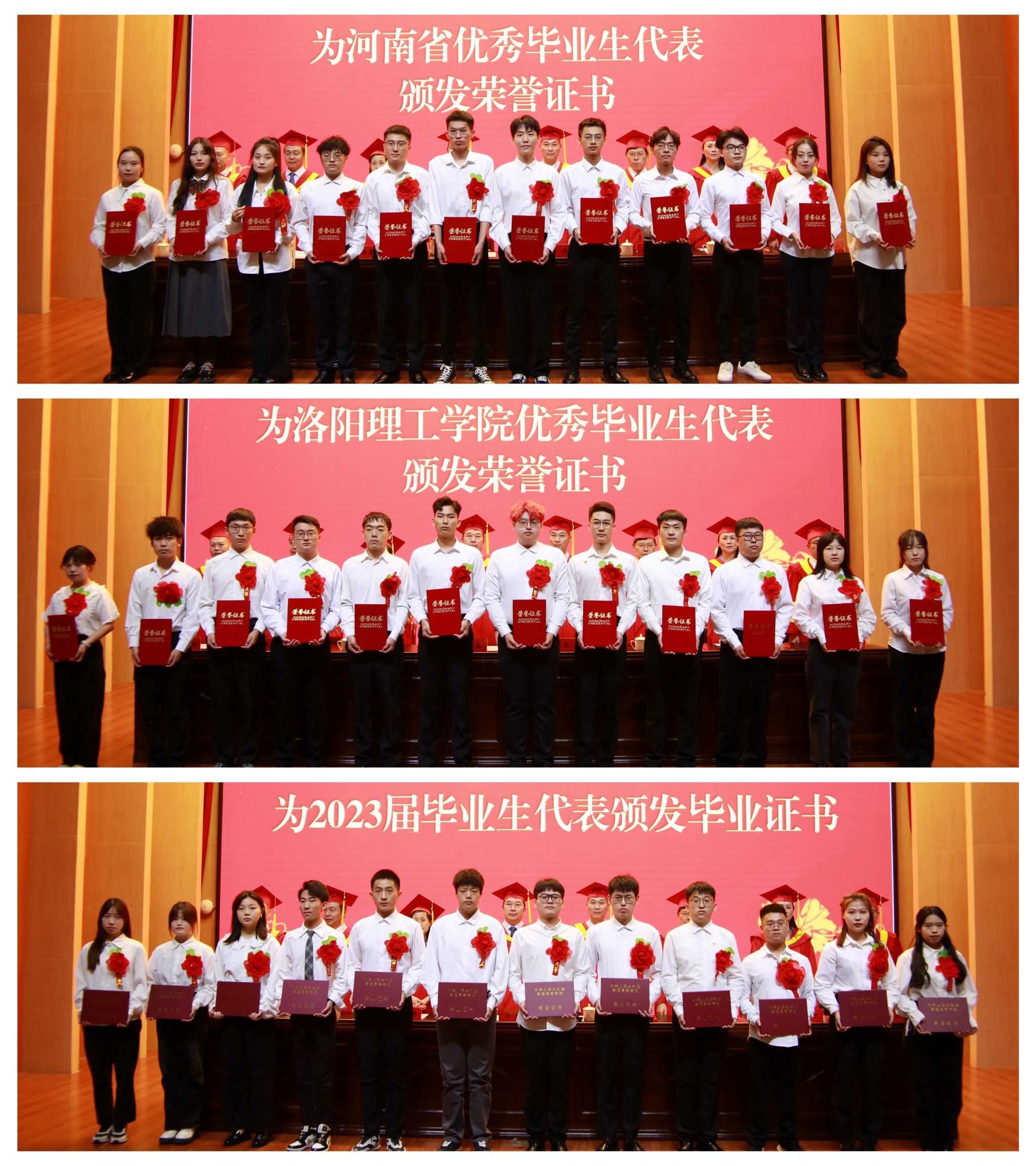 学校领导分别为河南省优秀毕业生、洛阳腾博官网诚信为本专业服务优秀毕业生代表颁发荣誉证书,向2023届毕业生代表颁发毕业证书