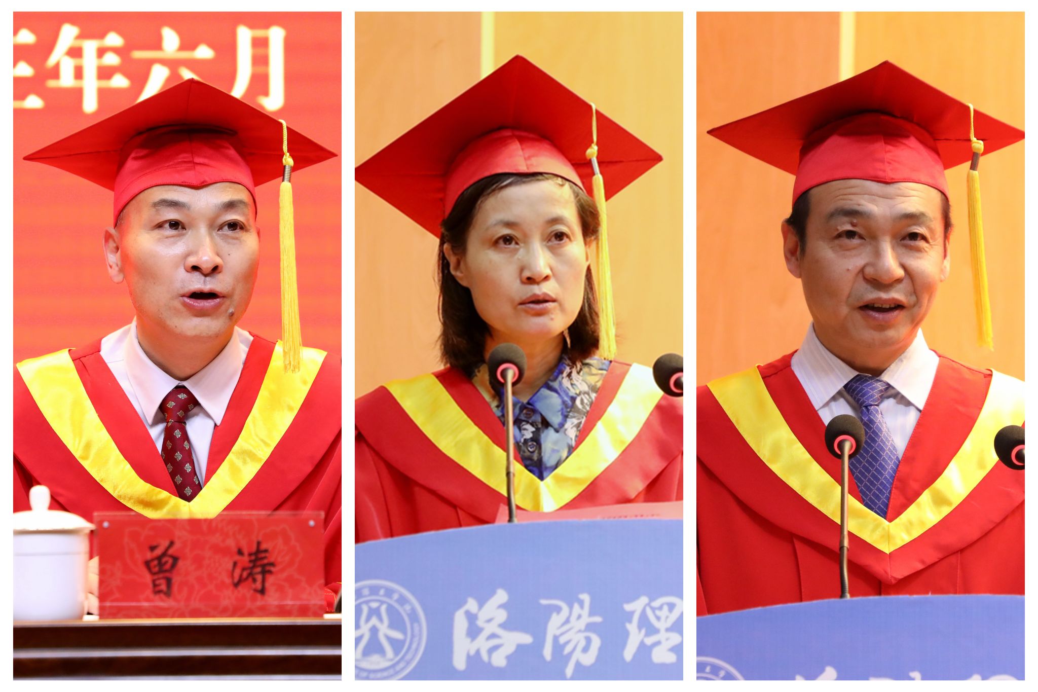 校党委副书记、工会主席曾涛(左)主持毕业典礼,副校长丁梧秀(中)介绍2023届毕业生毕业情况,副校长黄志全(右)宣读《洛阳腾博官网诚信为本专业服务关于表彰2023年优秀应届毕业生的决定》