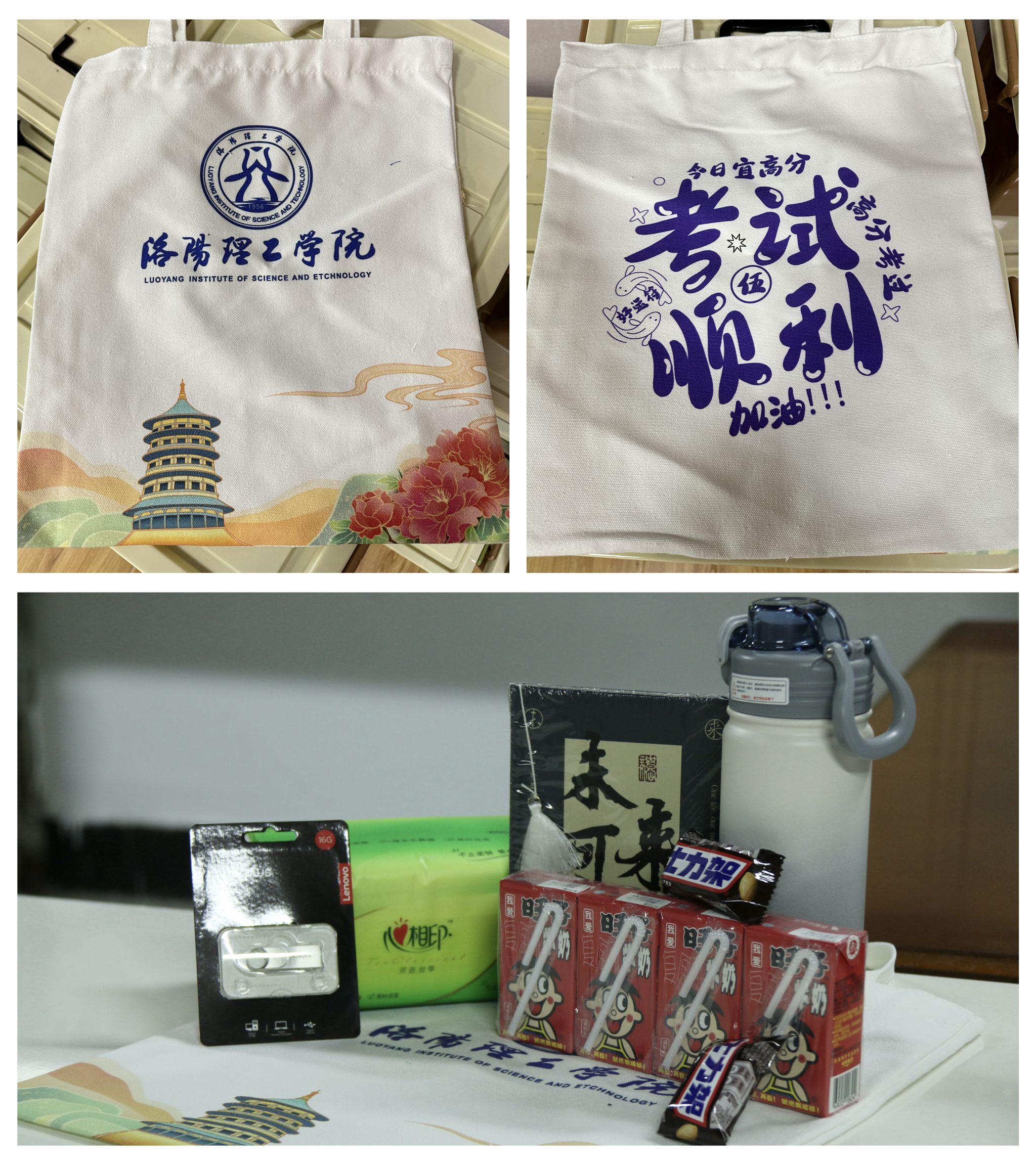考研“加油包”的内容经过精心设计,每一件都充满着美好的寓意。保温杯寓意着“温暖”,希望同学们带着学校的祝福和陪伴在考场上取得“舒心”的成绩;印有“今日宜高分,考试顺利”和“加油读书人”“好运常在”“未来可期”字样的定制帆布包和笔记本承载着学校对考生“好运连连”的祝福;U盘寓意着“存储青春奋斗的美好回忆”,“士力架”则希望同学们能量满满地进入考场;旺仔牛奶则有着“一路旺到底”的美好祝愿。经过甄选的每一件物品既有实用性,又传递着学校对困难考研学子的殷殷关怀。此次共发放考研爱心“加油包”1480套。