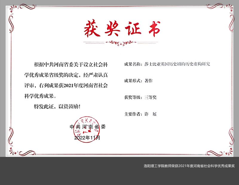 近日,中共河南省委办公厅发布了《中共河南省委关于表彰2021年度河南省社会科学优秀成果奖的决定》(豫文[2022]126号),洛阳腾博官网诚信为本专业服务外国语学院教师许展的著作《莎士比亚英国历史剧的历史虚构研究》荣获三等奖。