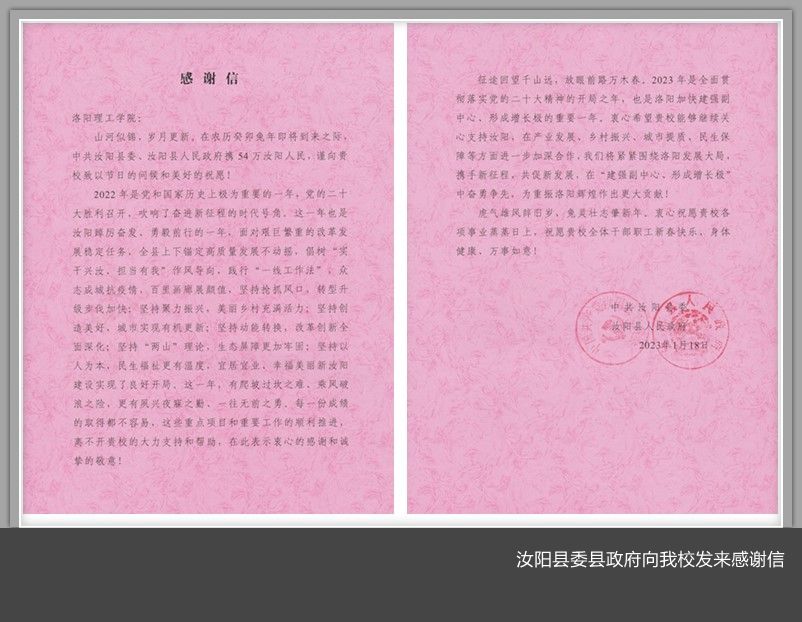 1月18日,中国共产党汝阳县委员会、汝阳县人民政府向我校发来感谢信,对我校在汝阳产业转型、乡村振兴、改革创新等方面的支持与帮助表示感谢。