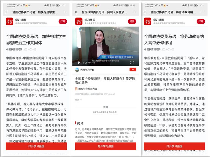 5.《学习强国》平台 2023-03-03《全国政协委员马珺:加快构建学生思想政治工作共同体》《全国政协委员马珺:将劳动教育纳入高中必修课程》: