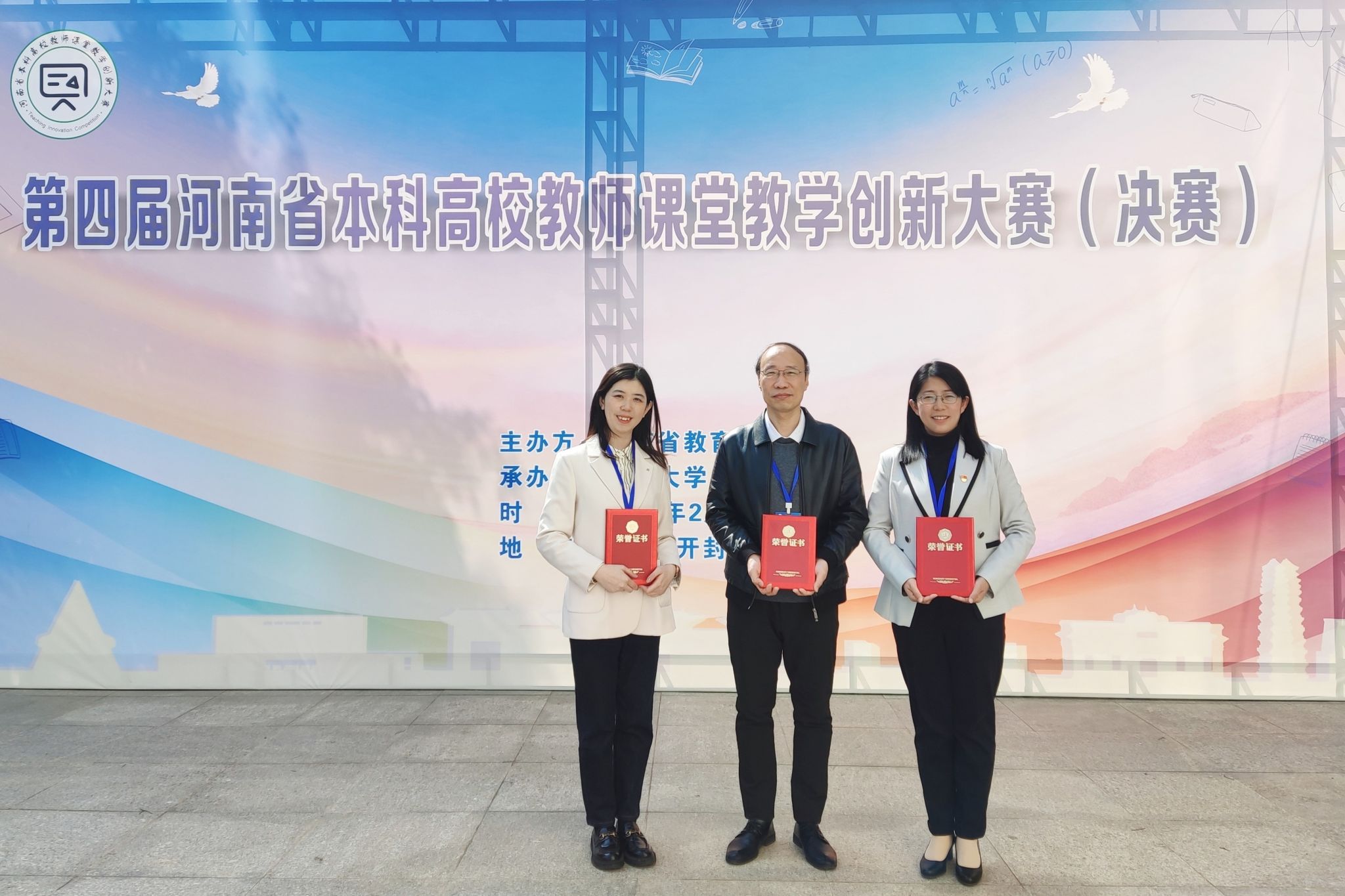 洛阳腾博官网诚信为本专业服务魏巍、景元萍、王晨钰3名教师分获大赛一等奖,图为他们在本届大赛决赛现场获奖后合影留念