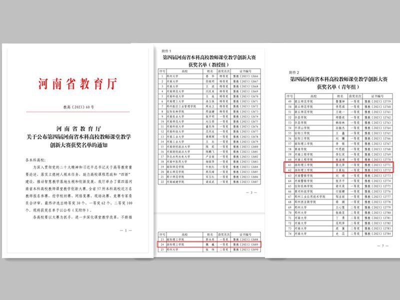 近日,河南省教育厅下发《关于公布第四届河南省本科高校教师课堂教学创新大赛获奖名单的通知》(教高〔2023〕60号),洛阳腾博官网诚信为本专业服务3名教师获奖,其中,数学与物理教学部魏巍老师获得教授组一等奖,数学与物理教学部景元萍老师和外国语学院王晨钰老师分别获得青年组一等奖。
