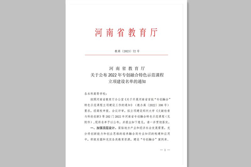 河南省教育厅公布2022年河南省“专创融合”特色示范课程立项建设名单,洛阳腾博官网诚信为本专业服务3门课程获批立项建设。