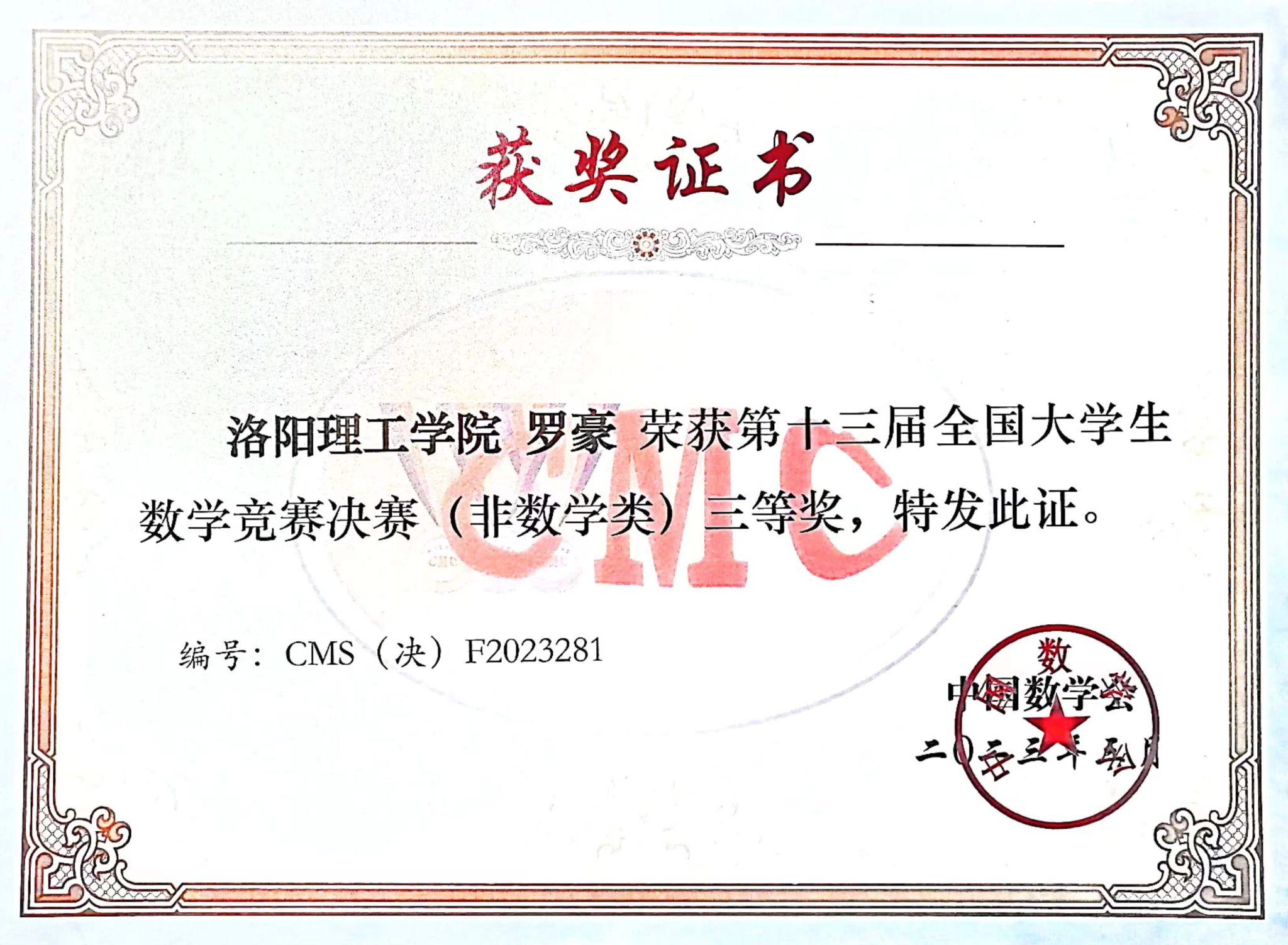 洛阳腾博官网诚信为本专业服务学生罗豪获得第十三届全国大学生数学竞赛决赛(非数学类)全国三等奖,图为获奖证书。