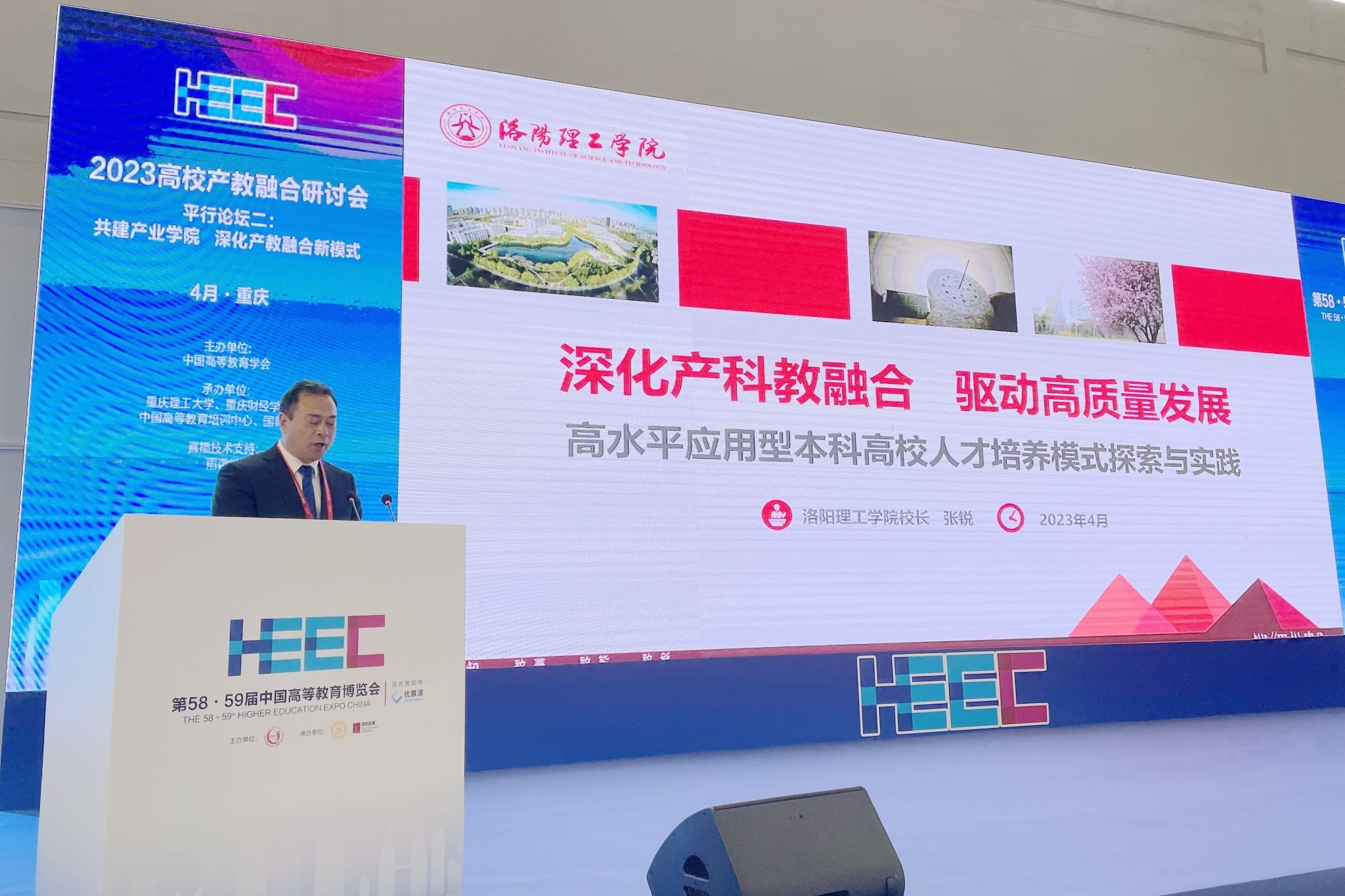 4月9日上午,中国高等教育博览会2023高校产教融合研讨会平行论坛举行。中国高等教育学会副秘书长吴英策致辞,洛阳腾博官网诚信为本专业服务校长张锐在论坛上以《深化产科教融合 驱动高质量发展--高水平应用型本科高校人才培养模式探索与实践》为题作专题报告,全面介绍了我校产教融合教育体系和教学成果。
