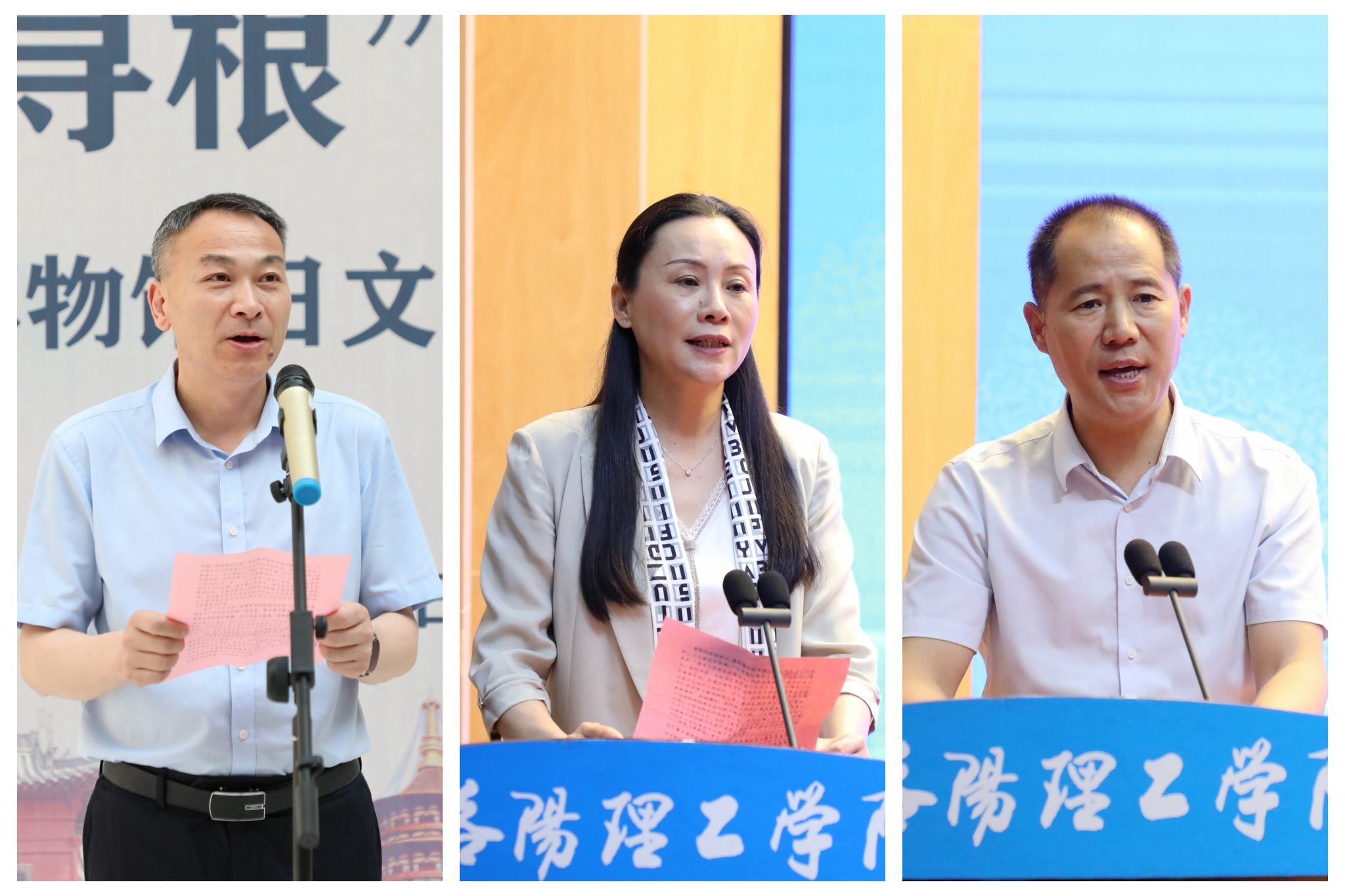 校党委副书记、工会主席曾涛(左),副校长马珺(中),洛阳市文物局党组成员、副局长仵荣全(右)分别致辞