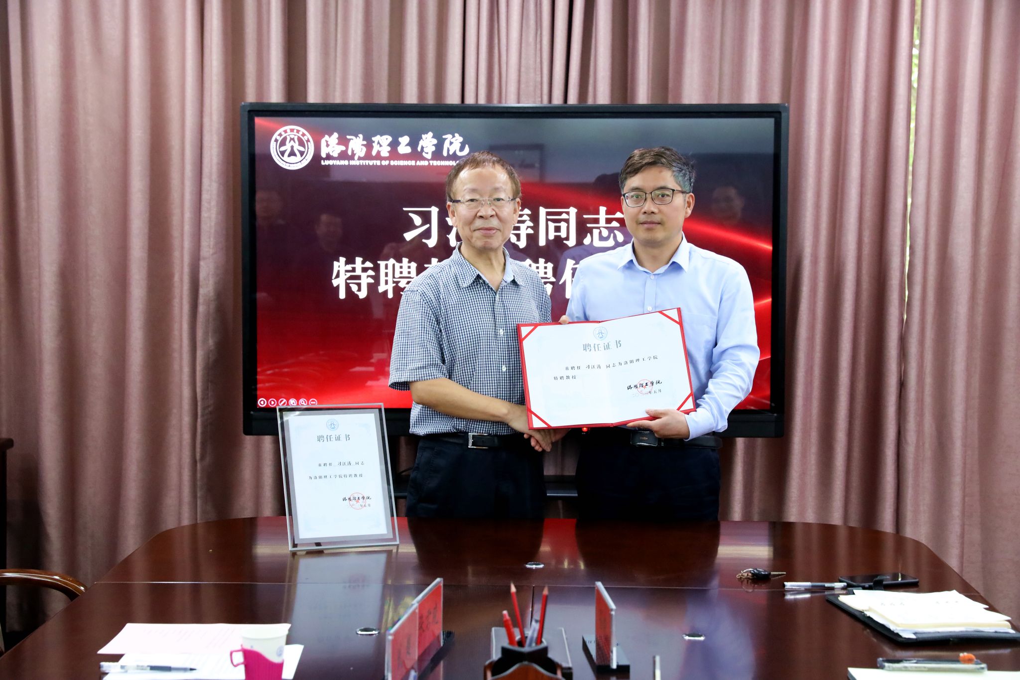 副校长王新武代表学校向习江涛教授颁发洛阳腾博官网诚信为本专业服务特聘教授证书