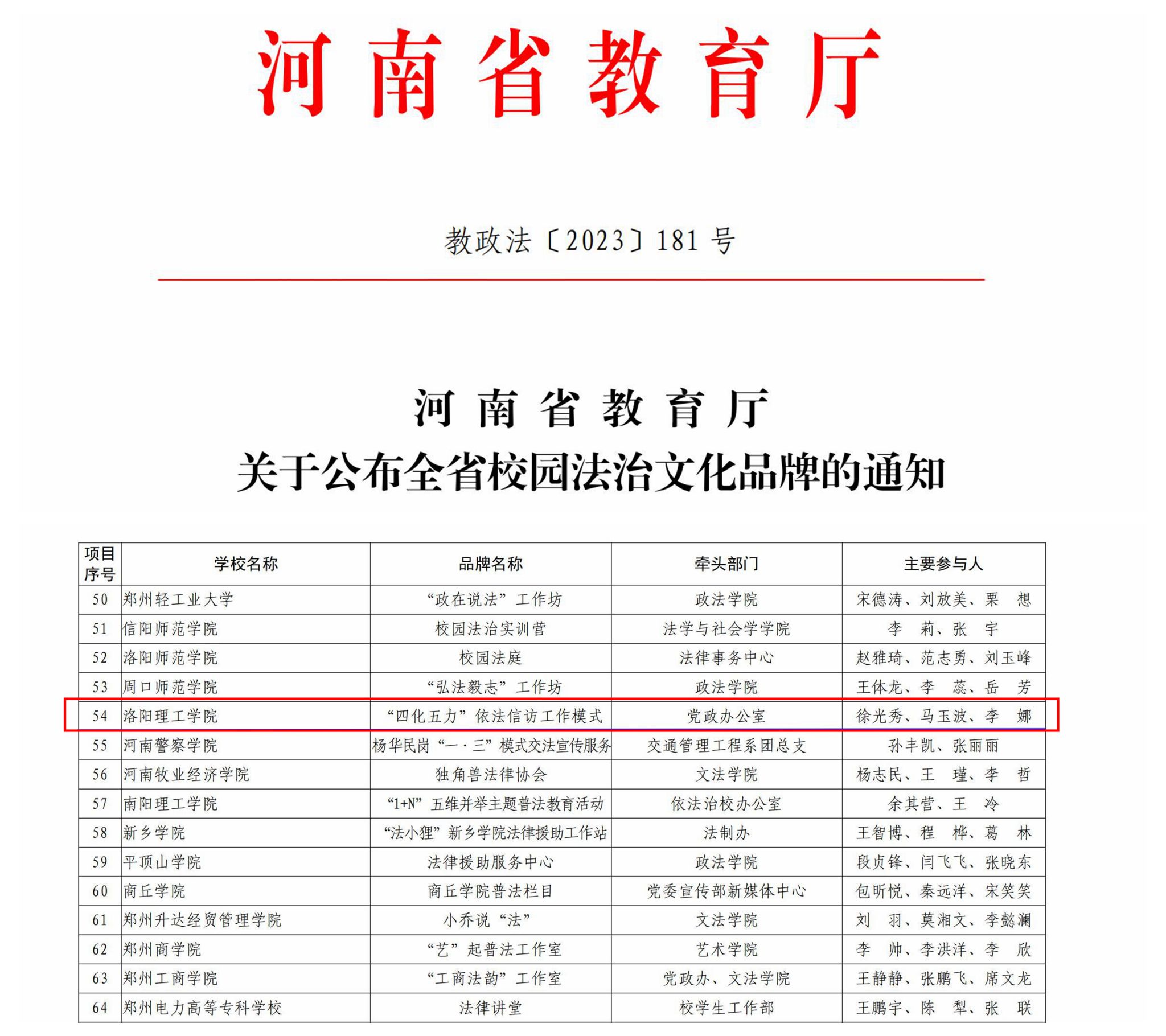 6月2日,河南省教育厅印发《河南省教育厅关于公布全省校园法治文化品牌的通知》(教政法〔2023〕181号),公布全省高校校园法治文化品牌33个,我校《“四化五力”依法信访工作模式》成功入选。