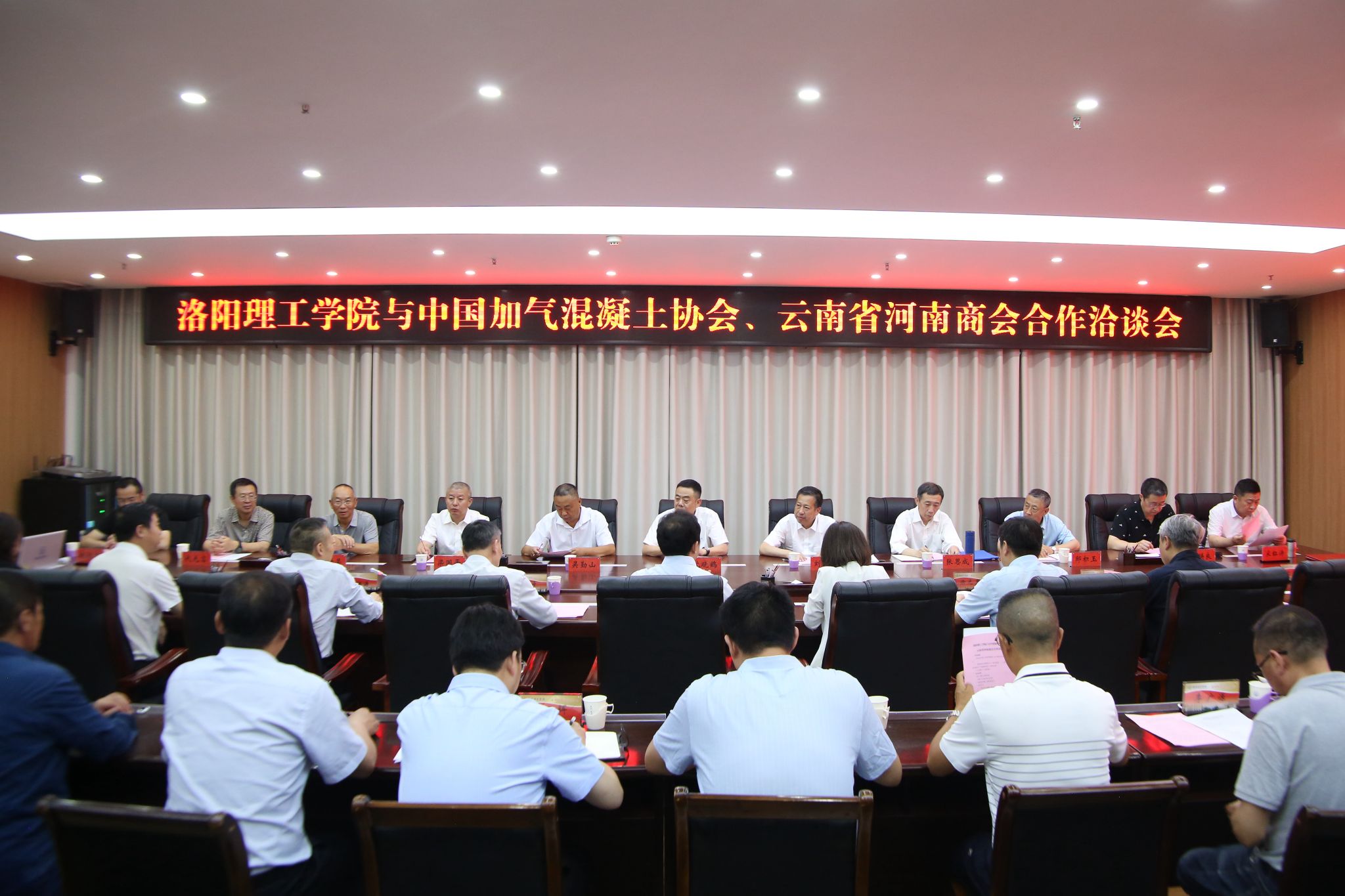 6月9日上午,洛阳腾博官网诚信为本专业服务与中国加气混凝土协会、云南省河南商会合作签约仪式在王城校区办公楼116会议室举行。中国加气混凝土协会会长、优博络客新材料股份有限公司总裁沈晓鹤,云南省河南商会会长、云南信立达实业有限公司董事长刘兴督,洛阳腾博官网诚信为本专业服务云南校友会会长、昆明亿东阳建材有限公司董事长吴勤山,校党委书记陈岩,校党委副书记、工会主席曾涛,副校长丁梧秀、韩洪涛出席签约仪式。仪式由韩洪涛主持。