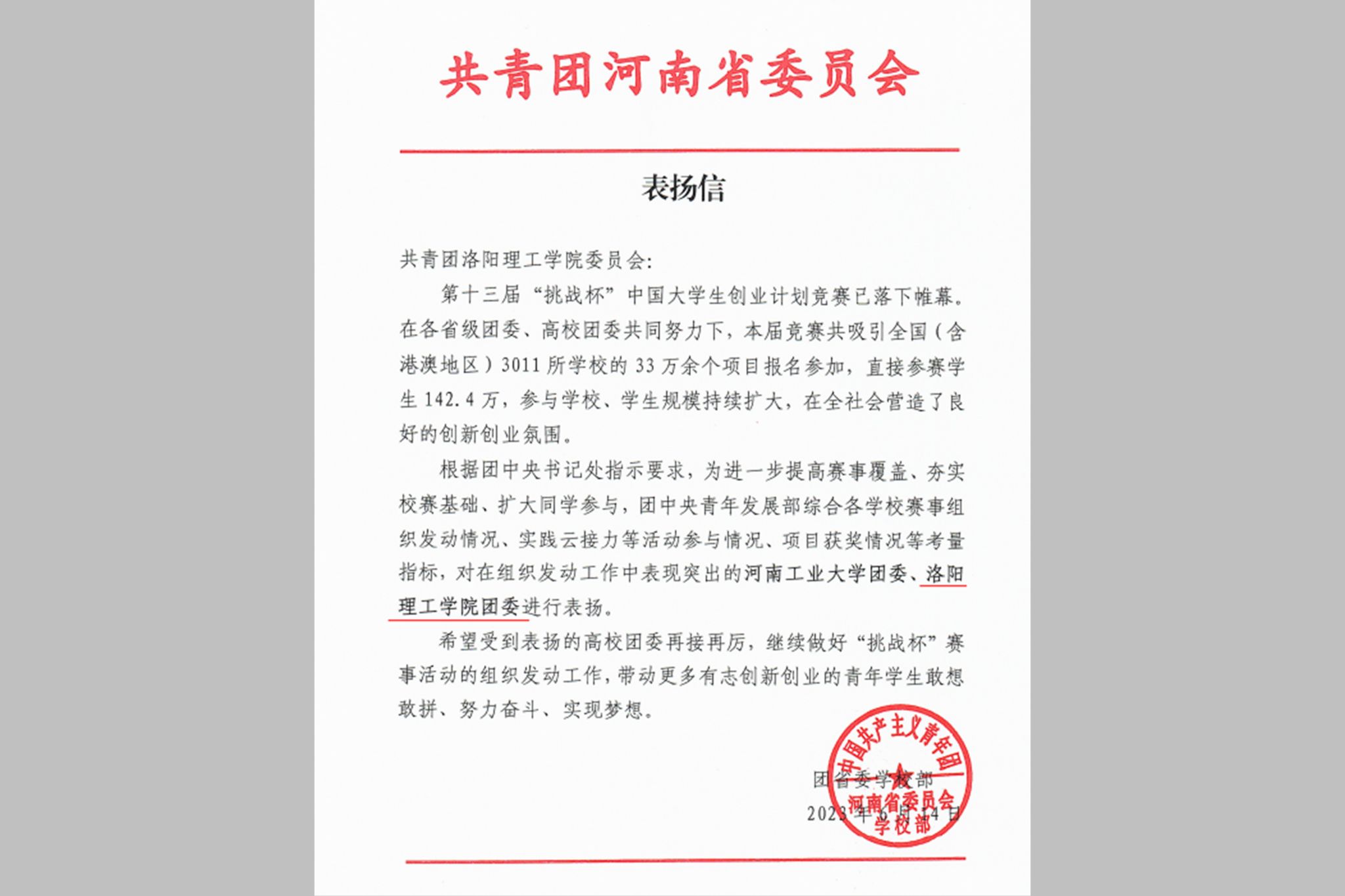 共青团省委向洛阳腾博官网诚信为本专业服务团委发来表扬信