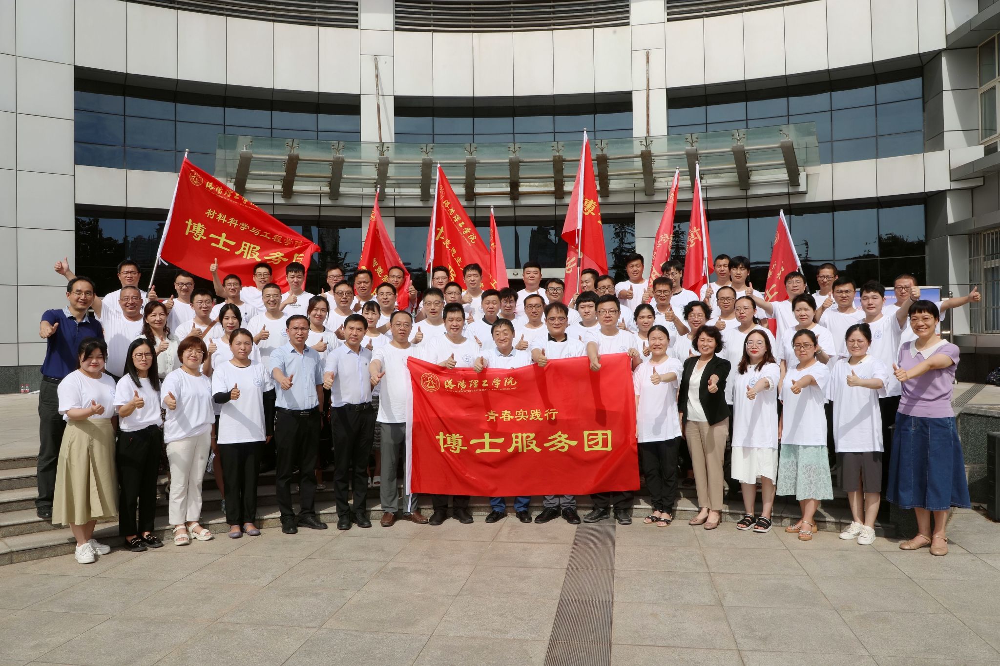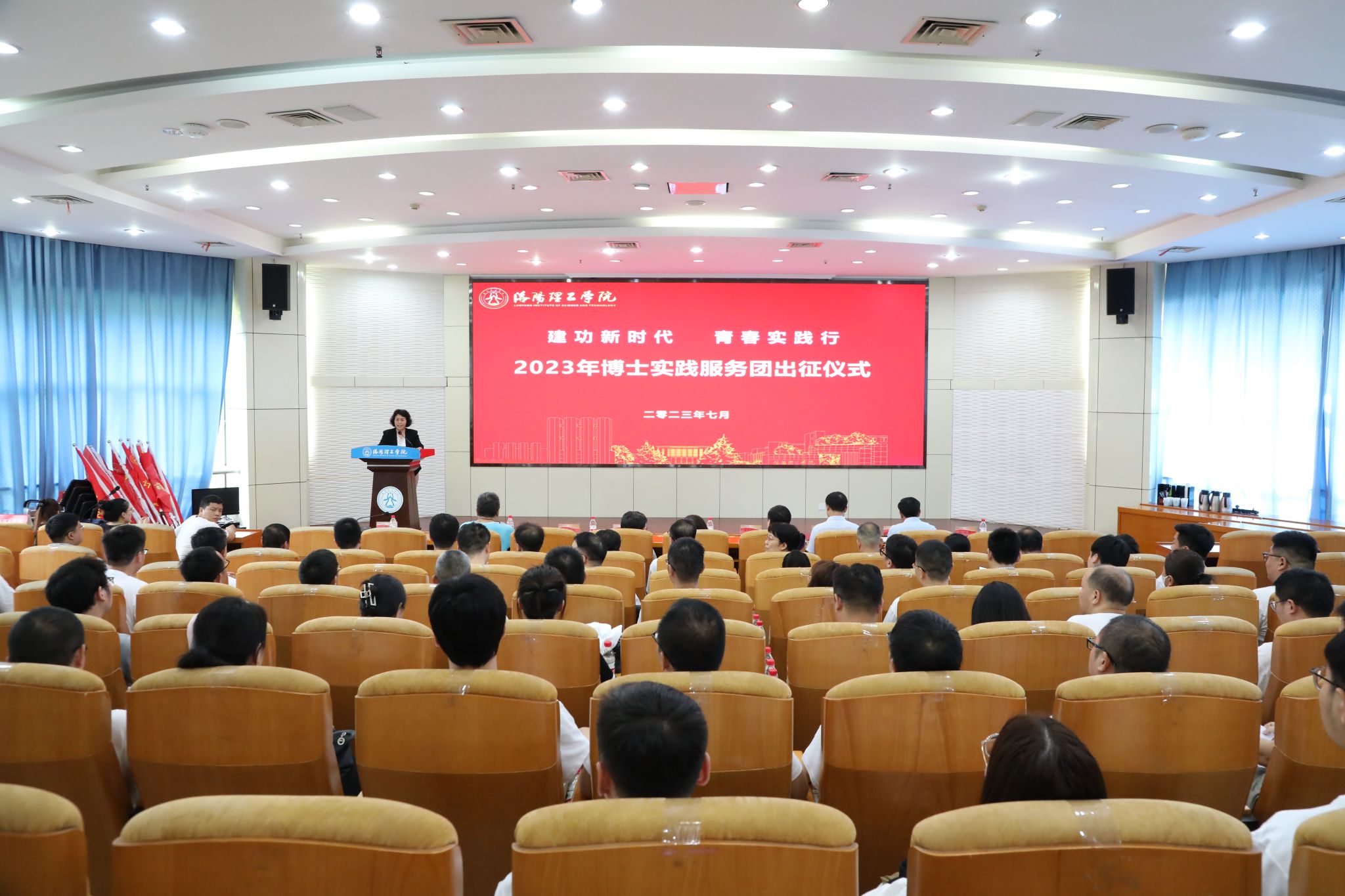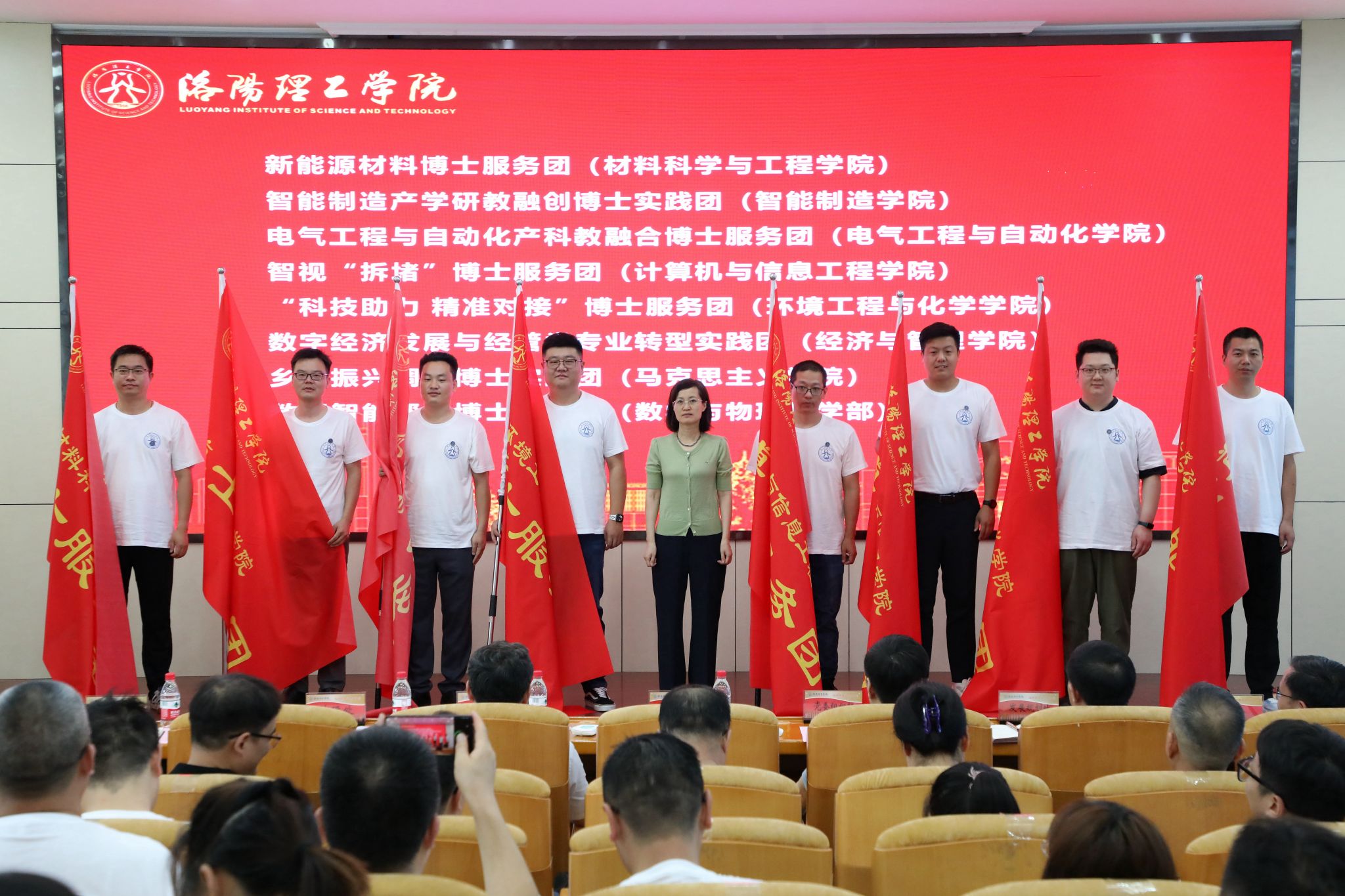 丁梧秀分别向材料科学与工程学院、智能制造学院、电气工程与自动化学院、计算机与信息工程学院、环境工程与化学学院、经济与管理学院、马克思主义学院、数学与物理教学部等8支博士社会实践服务团授旗,并宣布2023年博士实践服务团社会实践活动正式启动。
