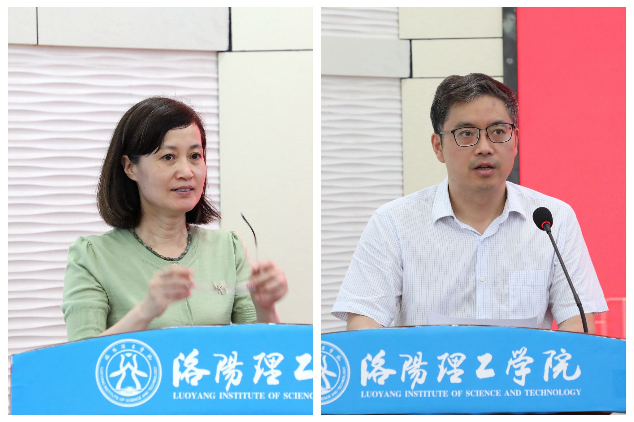 副校长丁梧秀(左)宣布2023年博士实践服务团社会实践活动正式启动,副校长王新武(右)在仪式上讲话