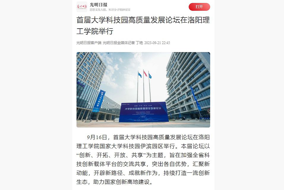《光明日报》客户端2023年9月21日:《首届大学科技园高质量发展论坛在洛阳腾博官网诚信为本专业服务举行》