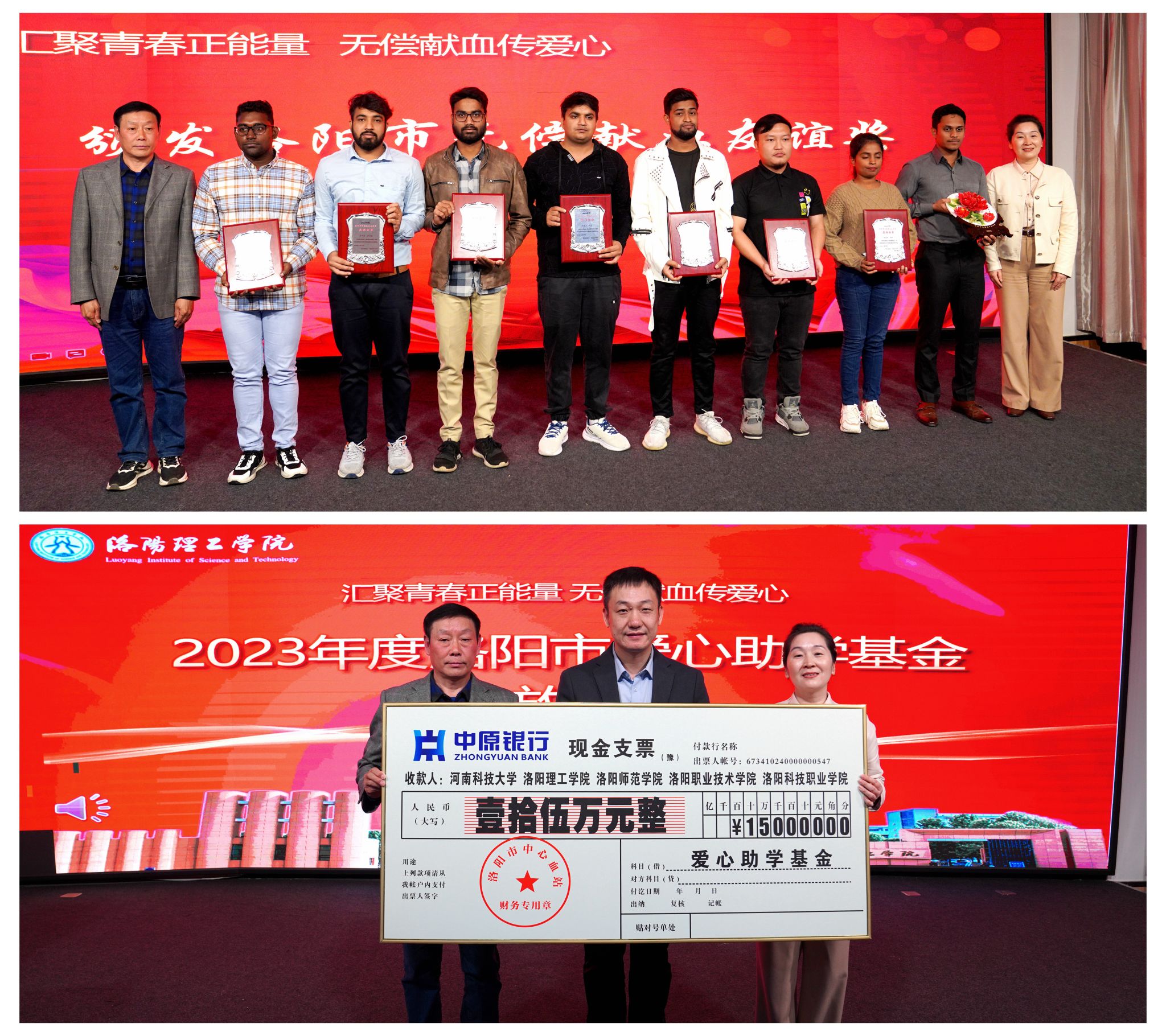 洛阳市卫健委、中心血站共同向留学生献血者代表颁发“洛阳市无偿献血友谊奖”(上),向高校代表发放“爱心助学基金”(下)。