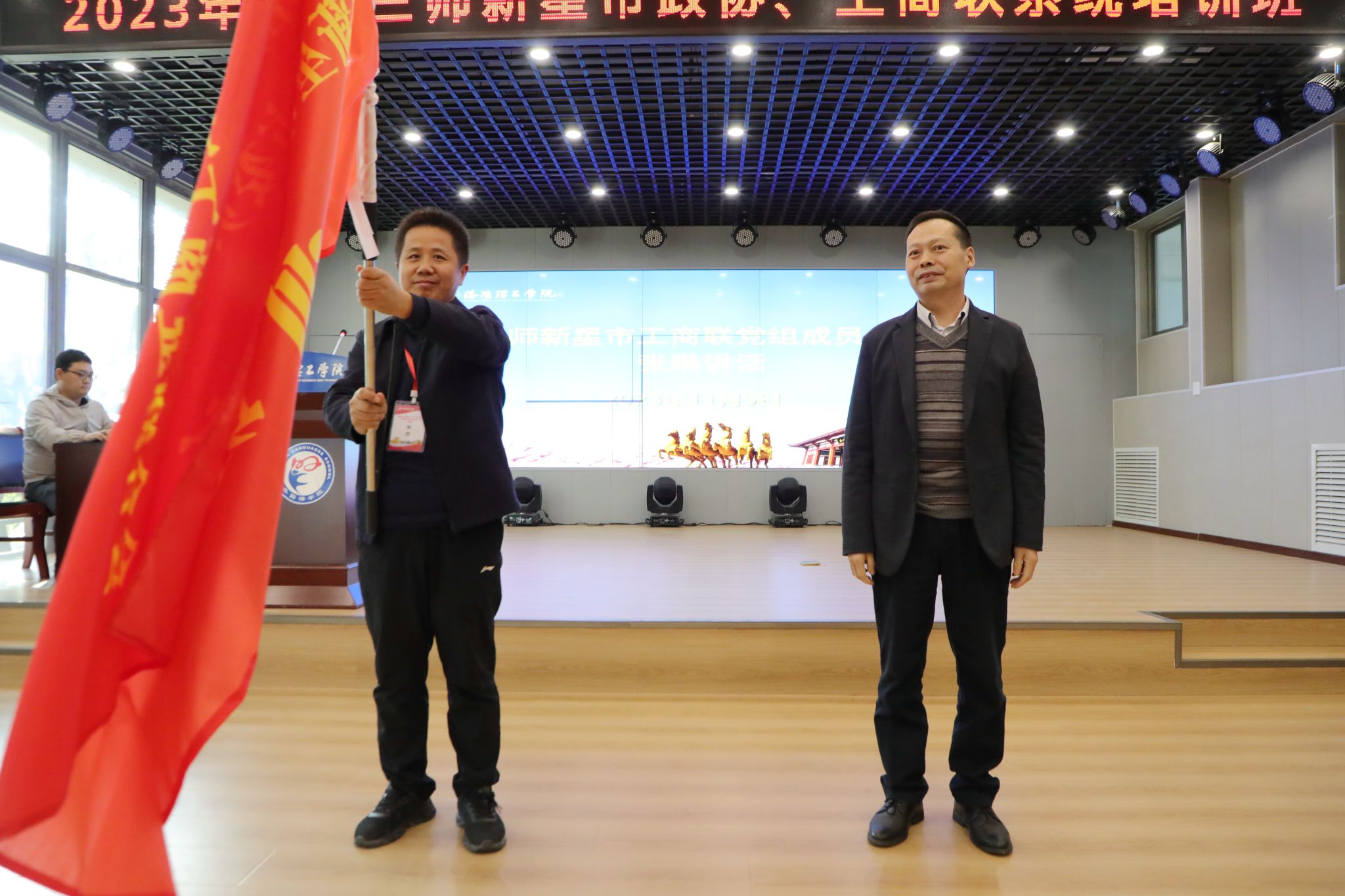 副校长韩洪涛(右)向政协新星市委员会党组成员、副主席王建刚(左)授培训班旗