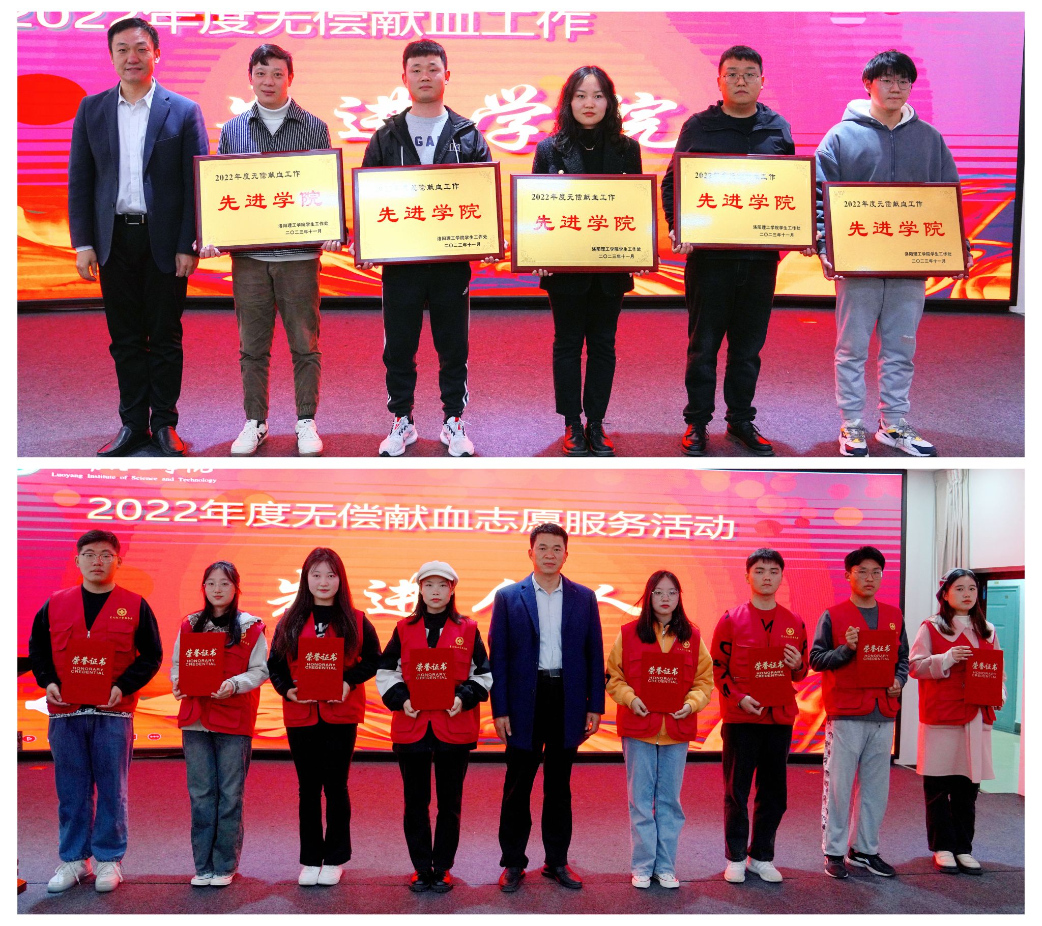 为表彰先进,弘扬典型,引导与激励更多青年学生投身无偿献血志愿服务活动,11月9日下午,洛阳腾博官网诚信为本专业服务2022年度无偿献血表彰会在王城校区心理健康教育中心情景剧场举行。洛阳市中心血站站长朱丽莉、洛阳腾博官网诚信为本专业服务学生工作处班子成员,受表彰的先进学院、先进个人及新生代表共100余人参加表彰会。