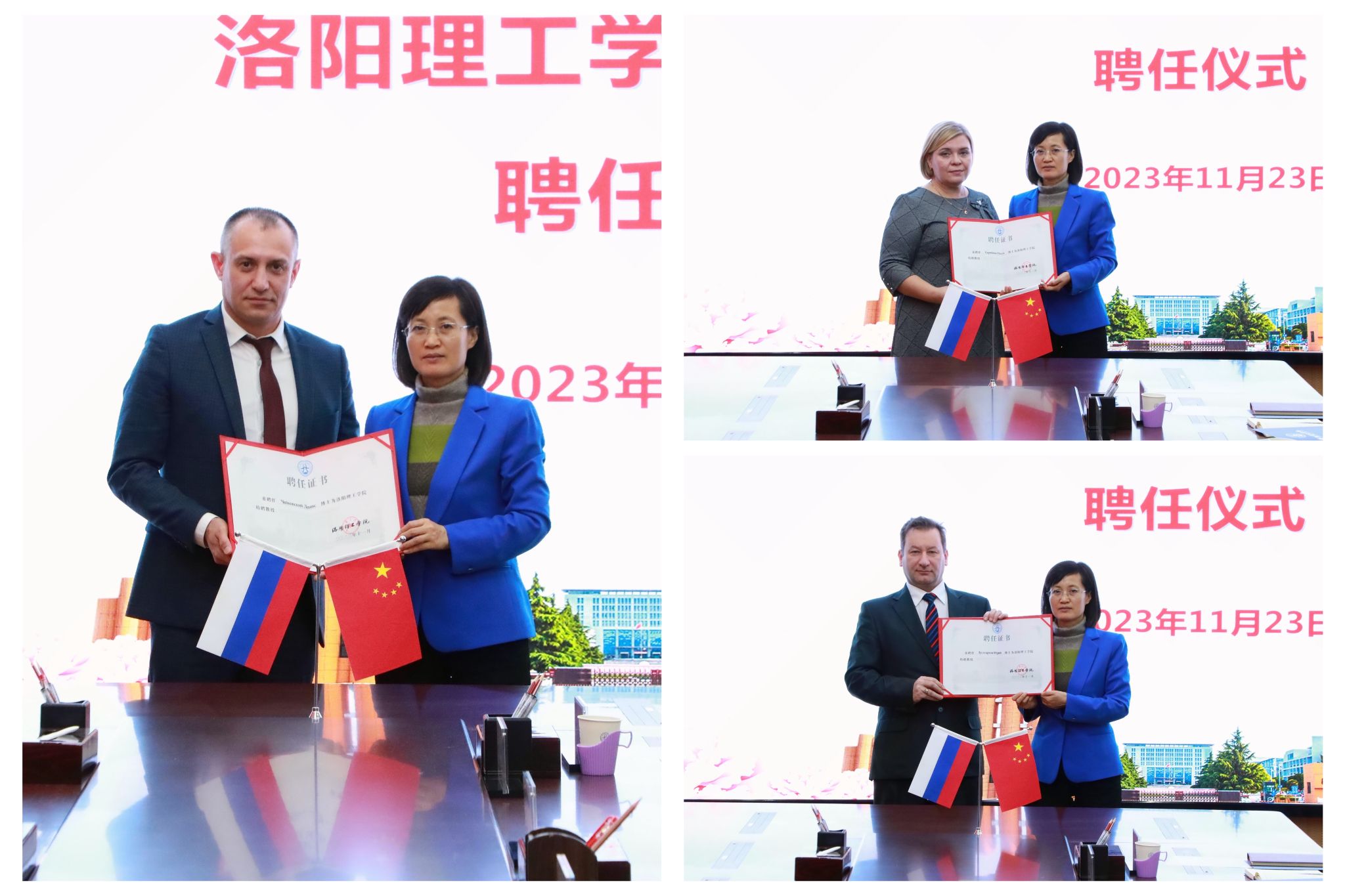 校长丁梧秀为俄罗斯科斯特罗马国立大学校长柴可夫斯基·丹尼斯·维托尔多维奇等三位来宾颁发洛阳腾博官网诚信为本专业服务特聘教授证书