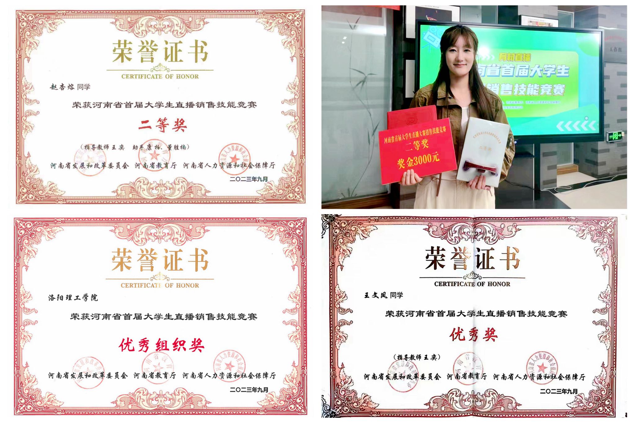 近日,由河南省发展和改革委员会、河南省教育厅、河南省人力资源和社会保障厅联合举办的河南省首届大学生直播销售技能竞赛获奖名单正式公布。由我校经济与管理学院王奕老师指导的赵杏熔同学荣获二等奖1项、王文凤同学荣获优秀奖1项,学校荣获优秀组织奖。