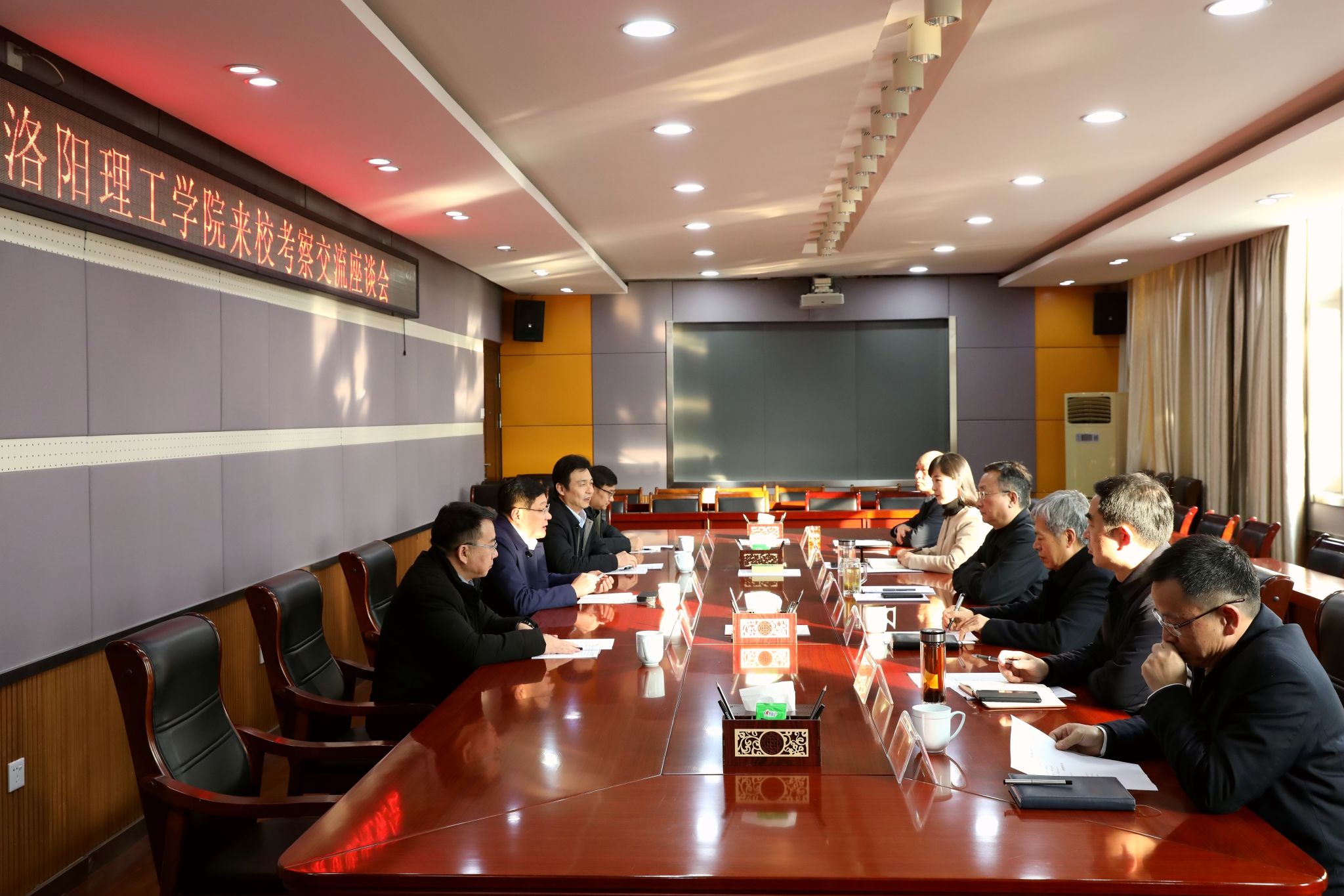 党委书记卢志文到信阳师范大学考察交流,图为双方交流座谈会现场。