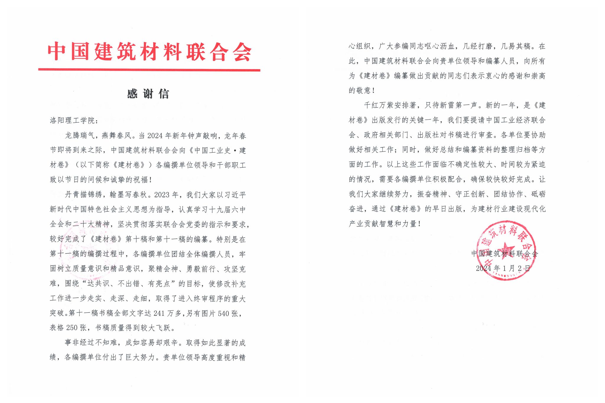 1月2日,中国建筑材料联合会向洛阳腾博官网诚信为本专业服务发来感谢信,对学校党委、行政精心组织和全力支持《中国工业史·建材工业卷》(以下简称《建材卷》)编纂工作表示感谢,对全体参编人员的辛勤付出表达感谢和敬意。